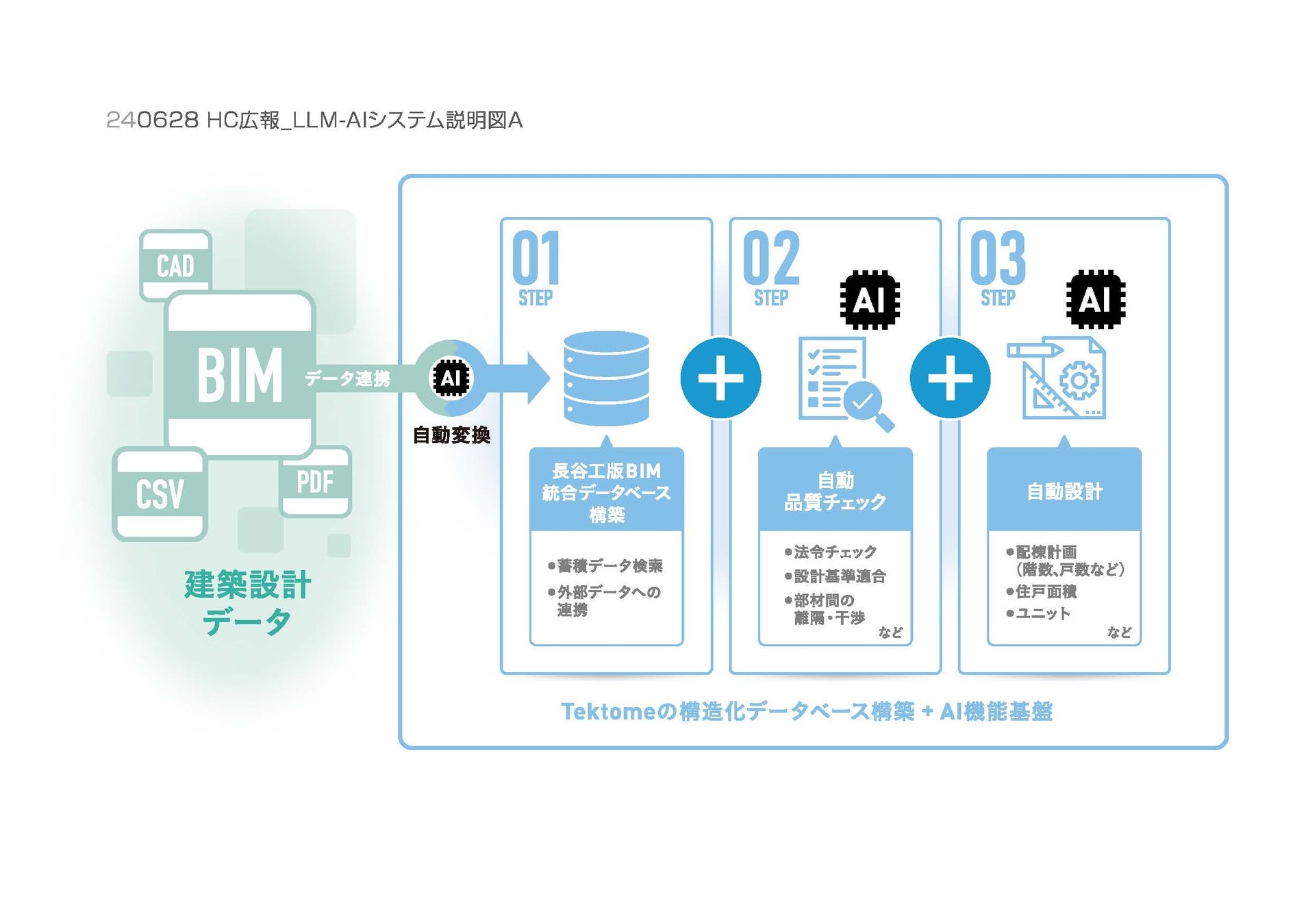 「Tektome」上に構築される長谷工AIシステムは、「長谷工版BIM※3」を活用した長谷工社のさらなるDX(デジタルトランスフォーメーション)の推進を目的とするものです。①「長谷工版BIM」が保有するデータと、BIMの外に保有する各種データを統合したデータベースの構築、②設計仕様データを利用した品質チェック機能の構築、③言語指示による自動設計機能の構築を段階的に進めることで、設計者のデータ入力および図面チェックに要する時間の50%削減を目指します。