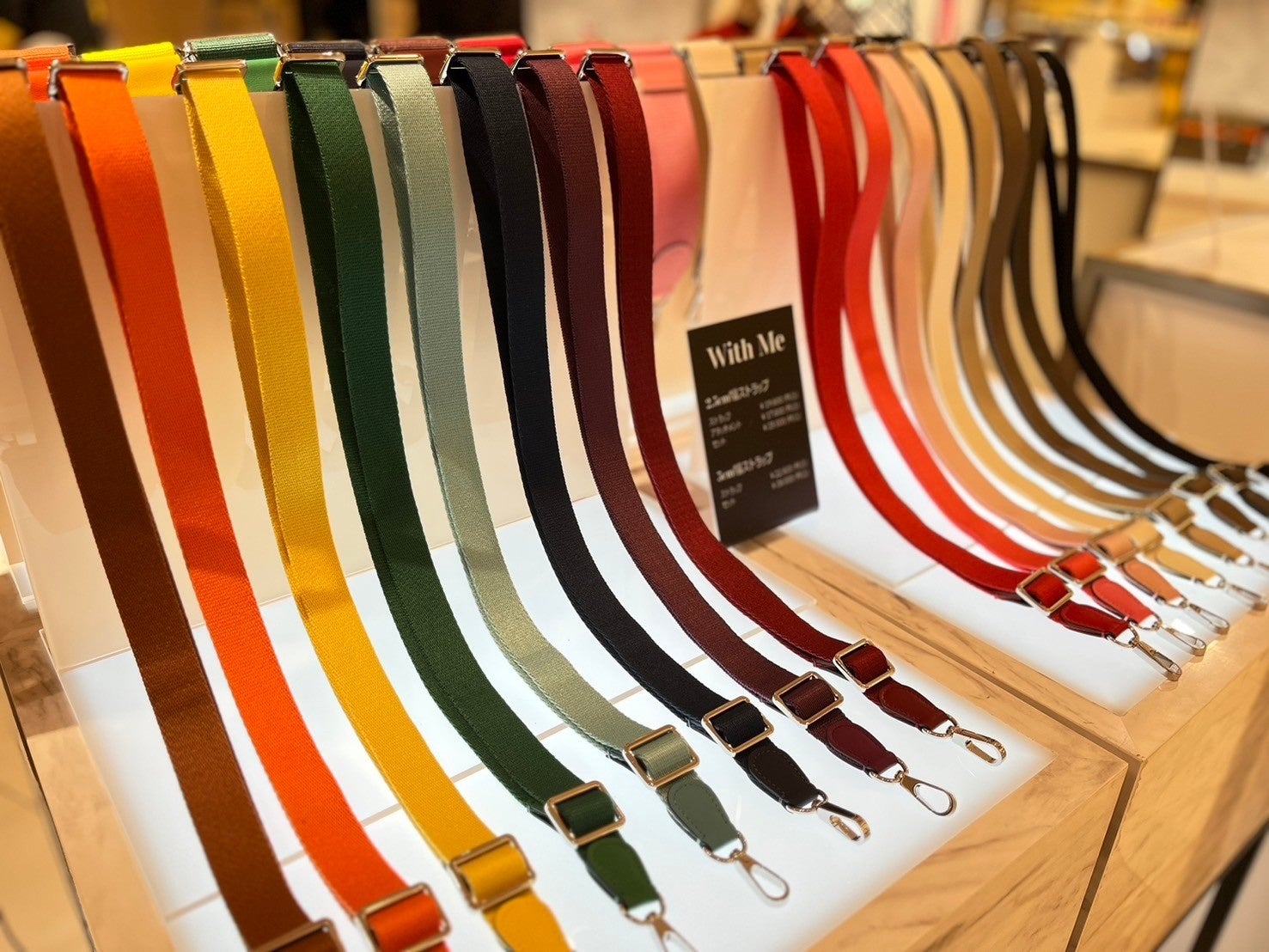 公園やショッピングなど親子でお出かけするシーンで、お気に入りのハイブランドのバスポーチをショルダーバッグとしてコーディネートできるオリジナルストラップ「With Me」は、全16色のカラフルなラインナップと上質な作りで、手に取るお客様が絶えない人気商品でした。
