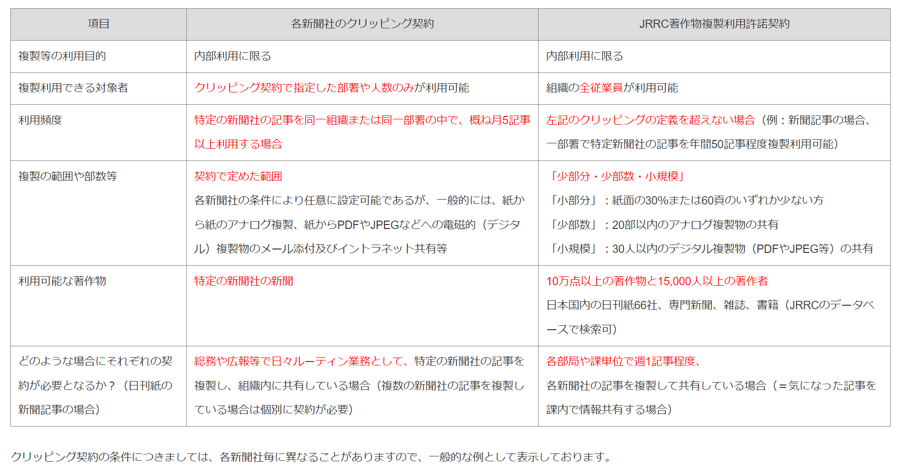 JRRCが一般社団法人新聞著作権協議会と確認したクリッピングの定義は、「一媒体の記事を、同一組織または同一部署の中で、概ね月5記事以上利用する場合はクリッピングに該当する」としています。ここでいう「一媒体」は特定の新聞を指します。また、「同一組織または同一部署の中で」とは、組織の大きさによって異なり、小さな組織においては、組織全体を指しますが、部門や部署が分かれている組織においては、例えば「課」単位を指します。さらに「概ね月5記事以上利用する場合」とは、週1回程度(年間50記事程度)、新聞記事を「同一組織または同一部署の中で」複製して共有する場合を指します。