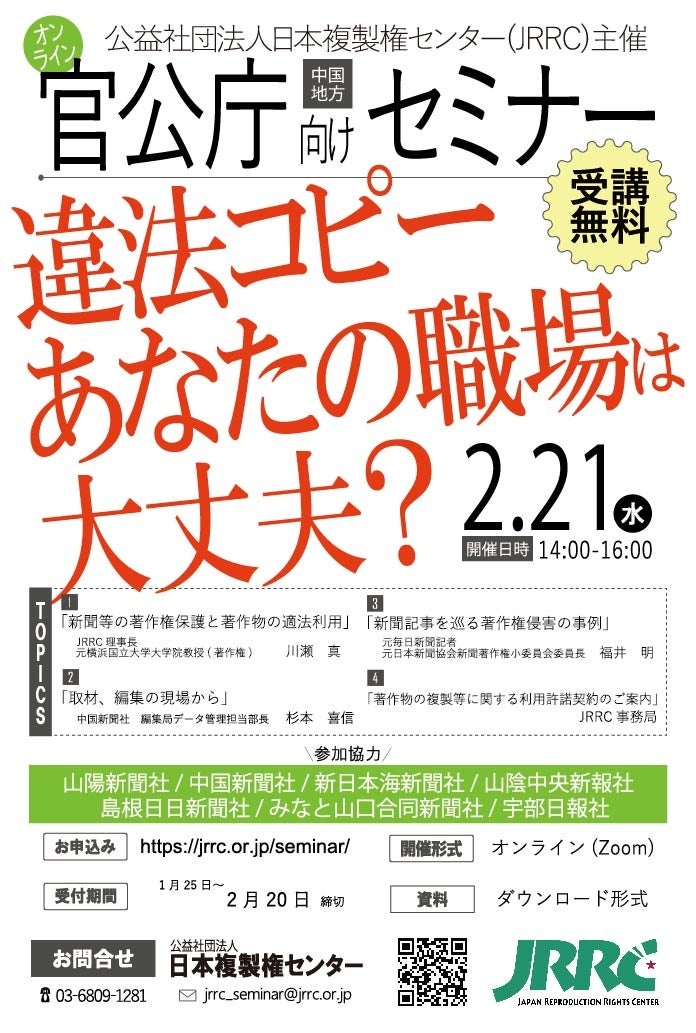 JRRCは、著作物の公正な利用や適切な流通を促進するとともに著作権思想の普及を目指しております。2023年度より官公庁向けの無料セミナーを地方の新聞社の方々の参加協力を得ながら行っております。