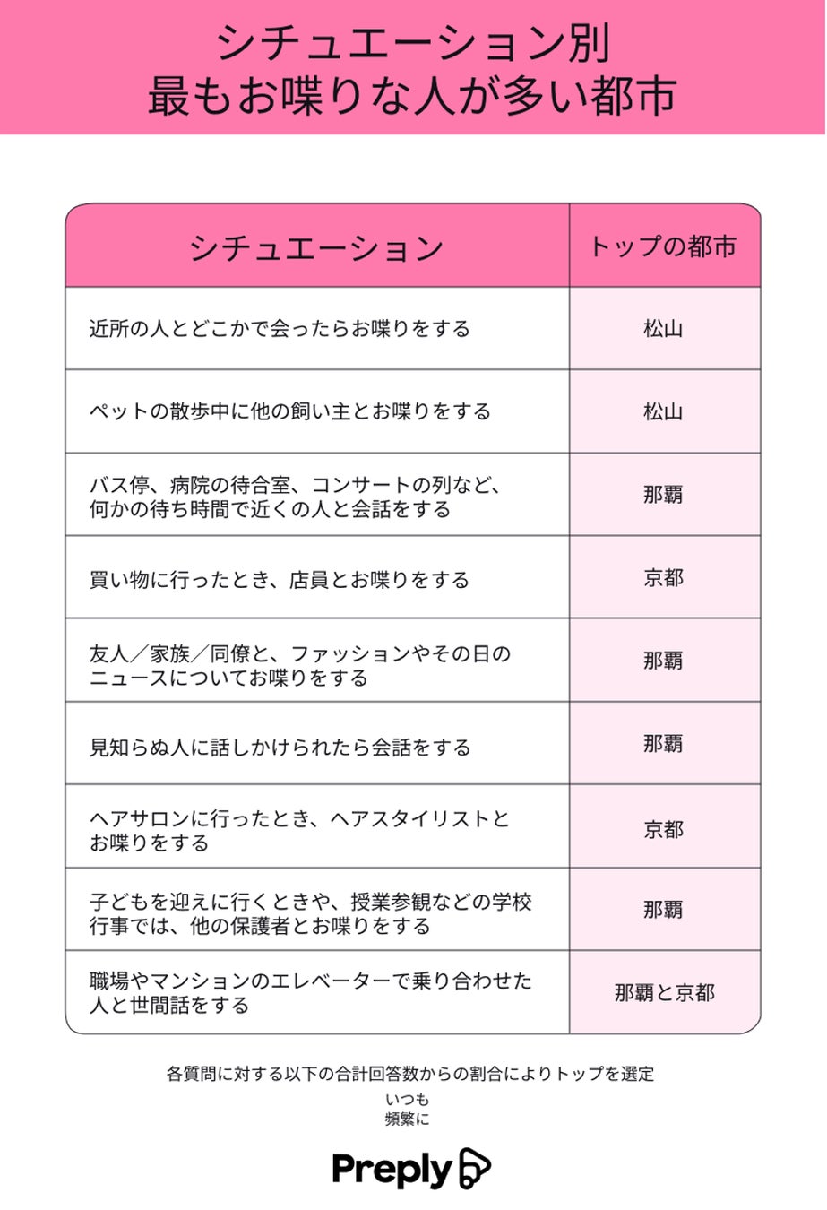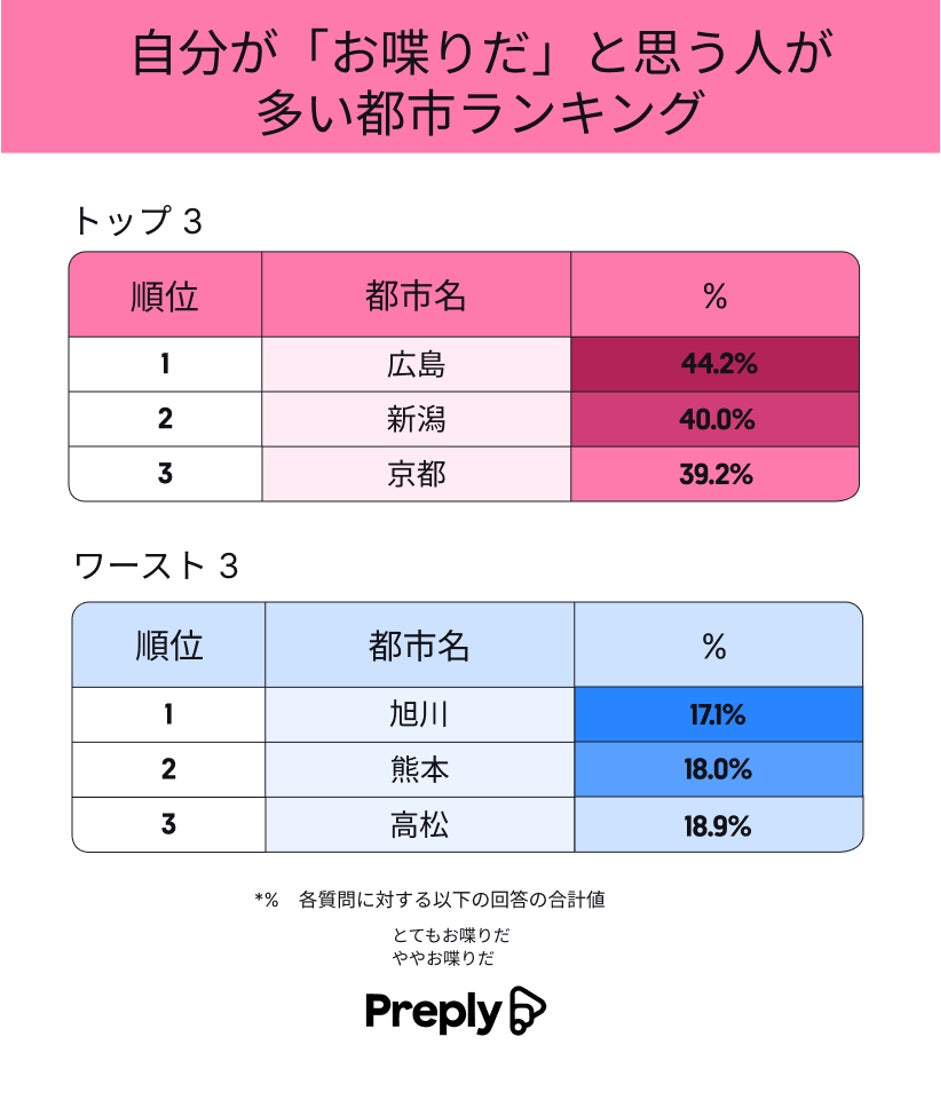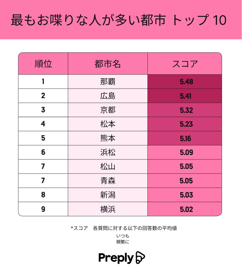 オンライン英会話をはじめ、講師とマンツーマンで学習ができる語学学習プラットフォームを提供するPreply(プレプリー / 米・サンフランシスコ)は、日本で最もお喋りな人が多い都市を調査しました。