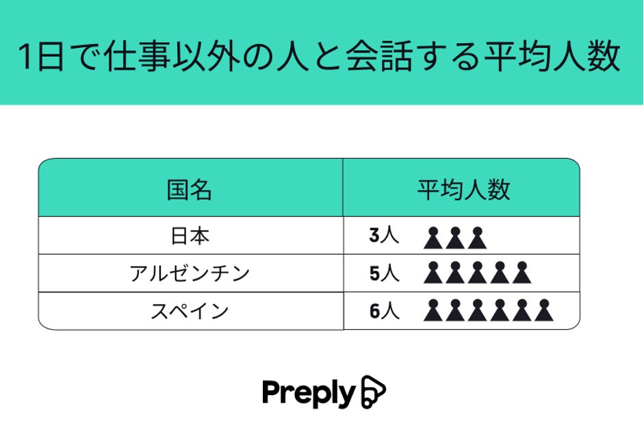調査の結果、日本人は職場の同僚などを除いて、平均して1日に約3人と会話していることが分かりました。この平均人数は、世界と比較すると少し低いかもしれません。同社の以前の調査から、スペイン人は1日に平均6人と会話することが分かっており、平均人数が日本人の2倍です。また、アルゼンチン人は1日あたり平均5人と会話することが分かっています。この結果は、日本人が世界から見るとやや控えめな印象を持たれることを裏付けています。