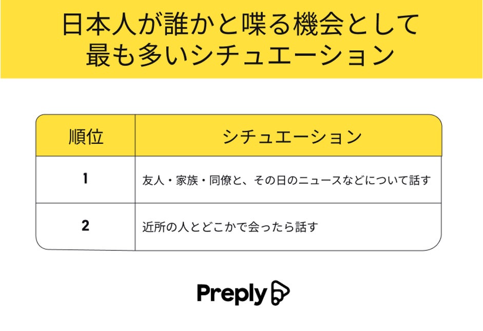 日本人が誰かと喋る機会として最も多いシチュエーションは、「友人・家族・同僚とその日のニュースなどについて話す」と「近所の人にどこかで会ったときに話す」でした。