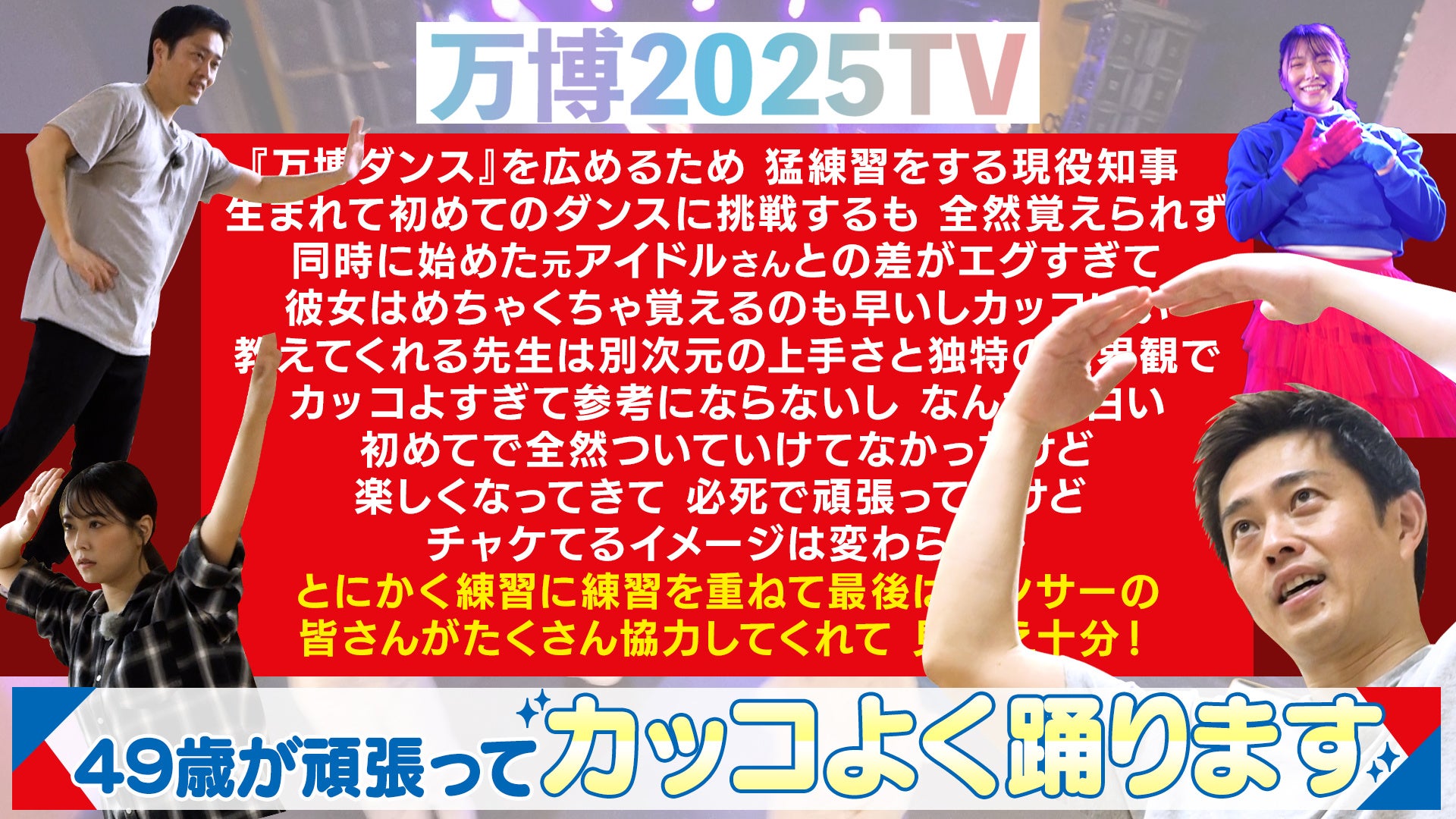 大阪•関西万博オフィシャルテーマソング コブクロ「この地球の続きを」のダンスの振付を担当した張本人である振付師の辻本知彦氏指導のもと、ダンスが苦手な吉村洋文氏(大阪府知事)が猛特訓
