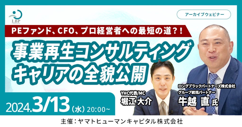 ヤマトヒューマンキャピタル株式会社(本社:東京都千代田区、代表取締役:堀江 大介)は、2024年3月13日(水)20:00よりオンラインにて、ロングブラックパートナーズ株式会社のグループ統括パートナー 牛越 直氏にご登壇いただくウェビナー『 事業再生コンサルティングキャリアの全貌公開!』を開催いたします。