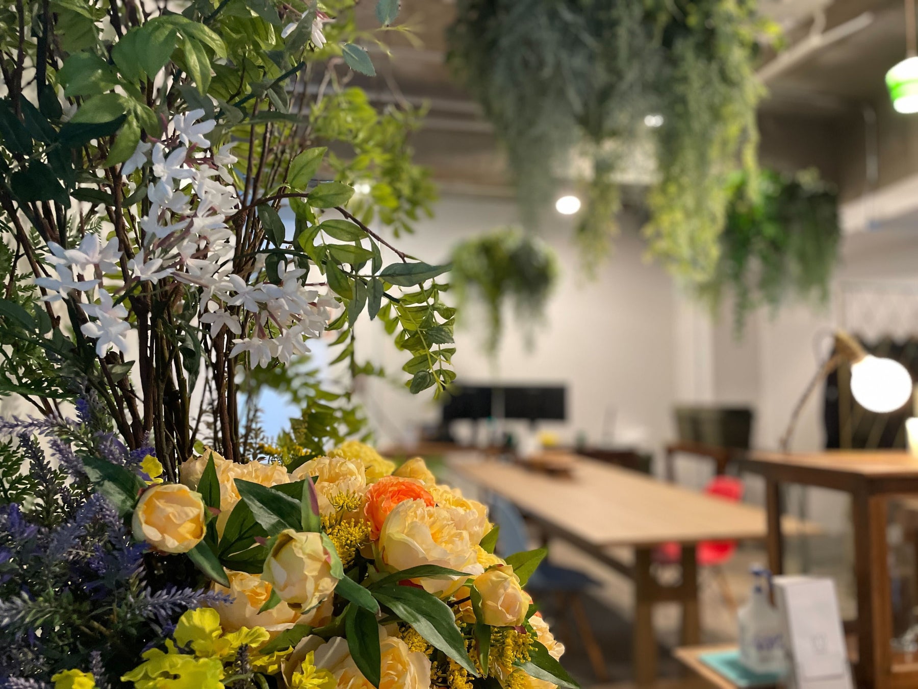 新オフィスでは、同ビルのコンセプトに合わせて、環境への配慮と創造性の両立を目指しています。具体的には、イベント等で発生する廃材を活用したフェイクグリーンの装飾を取り入れています。これにより、廃棄物を削減しつつ、魅力的な空間を創出することが可能となります。