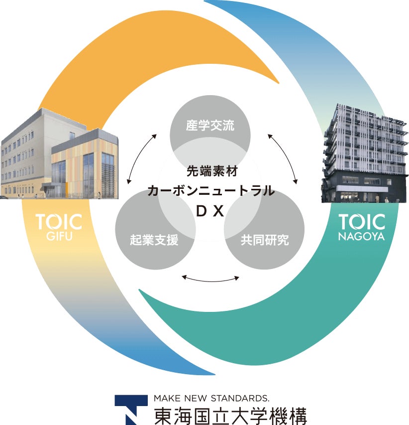 Tokai Open Innovation Complex(TOIC)とは、東海国立大学機構が強みや特色を有する研究リソースを活かし、オープンイノベーションを推進する産学融合拠点です。3つの取組み(産学交流、起業活動、共同研究)を連携して、支援することにより、企業やベンチャー、行政など多様なステークホルダーとの交流の場を創出し、新たなイノベーションの創出を実現します。