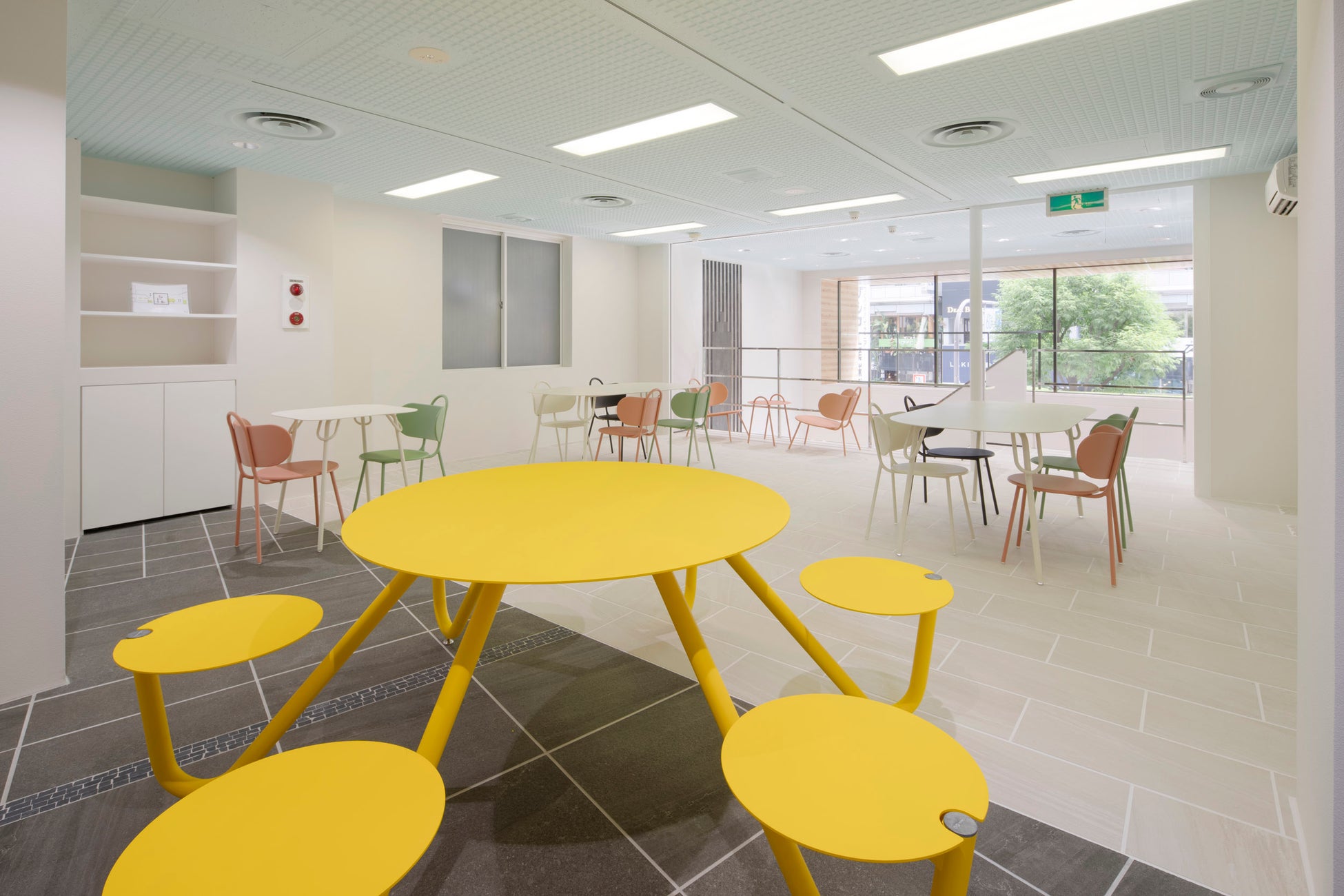 大阪の家具通りに程近い、四つ橋筋(大阪市道南北線)に面する大阪市北堀江のショールームでは、店舗のファザードからエントランス空間までガラス面を挟んで内外が一体化。自然光があふれるパブリックスペースに美しい色彩とデザインのストリートファニチャーが配置されています。