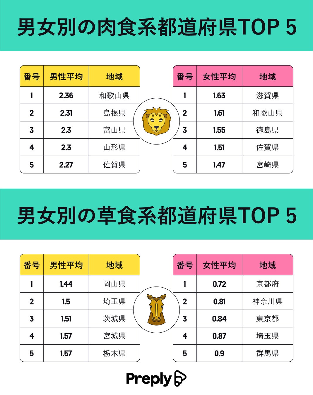 「和歌山県」は女性でも2位にランクインするなど、男女ともに『肉食系が多い』県だと言えるでしょう。