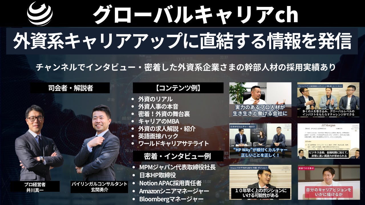 グローバルキャリアchでは、いま日系企業にて外資への転職に興味がある方や、いま外資にいて外資でのキャリアアップを狙っている方向けに、外資系企業の幹部の方への密着やインタビュー、転職・キャリアアップに関するノウハウ、英語面接対策、キャリア関連の時事解説など幅広い情報をお送りしているチャンネルです。
