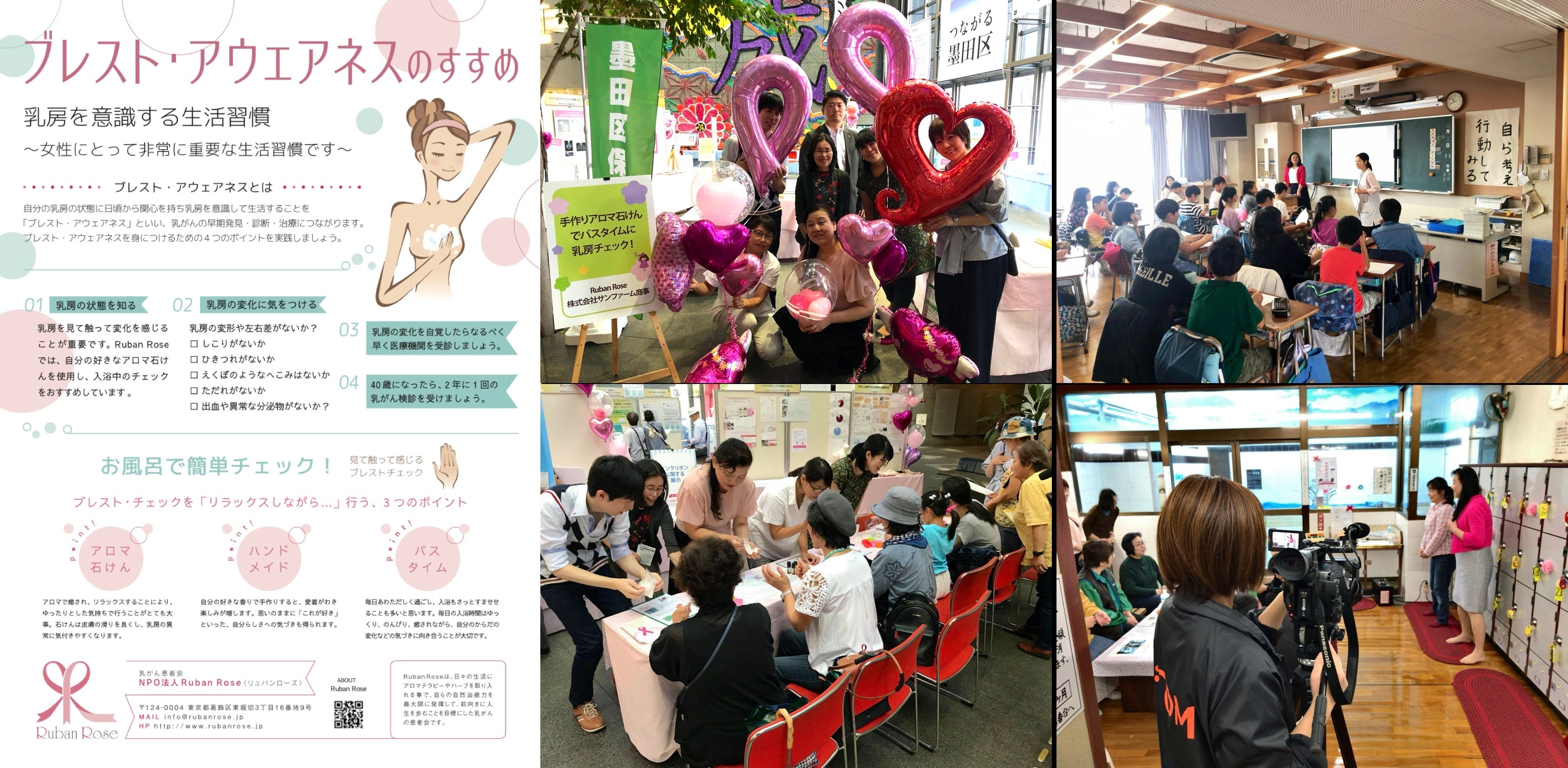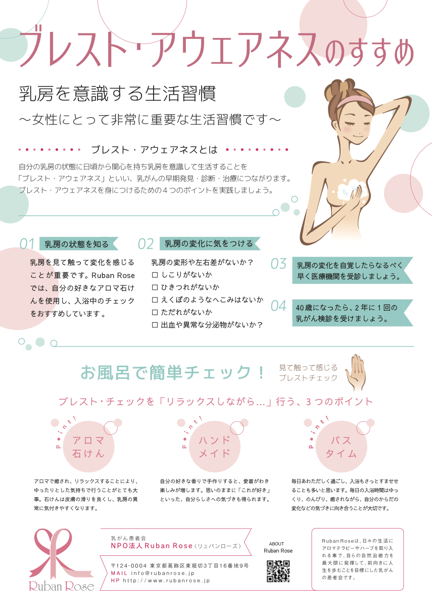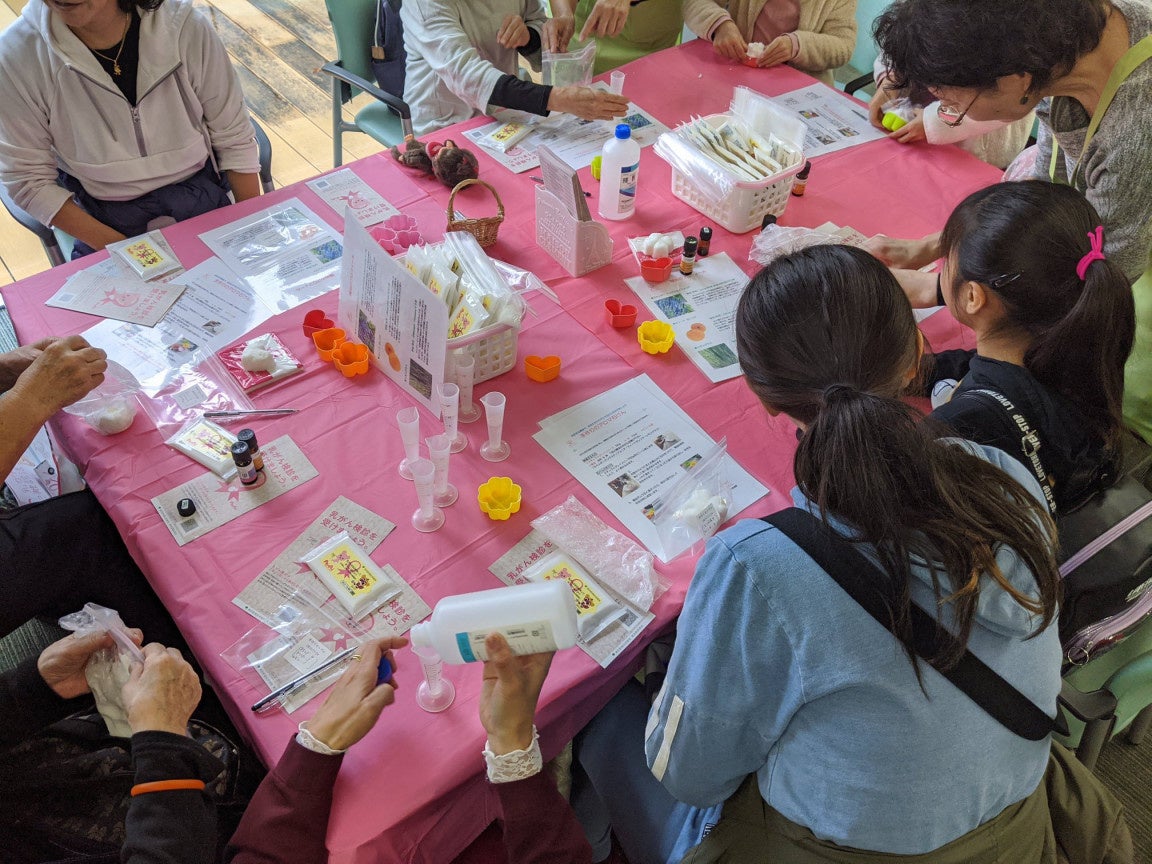 ・アロマ石けん作りを通して「これが好き」といった自分らしさへの気づきを与え、その石けんの香りによるリラックス効果やすべりを活用した お風呂で行う自己触診法 を “自分をいたわる心地よい時間” として提案
