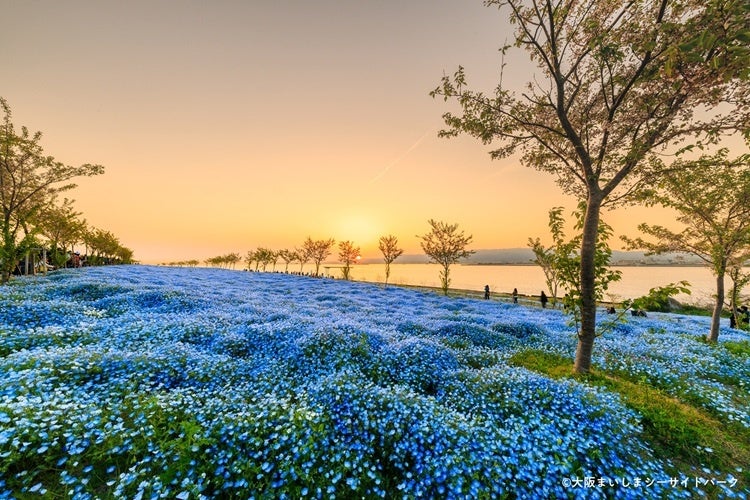 会場には大きな「MAISHIMA」モニュメントや季節の花とネモフィラのコラボレーションが見られるエリアなど、多数のフォトスポットを設けています。また、日没にかけてのロング営業を土日祝日・ゴールデンウィーク限定で実施します。「日本の夕陽百選」※にも選ばれた舞洲の夕陽に照らされて、昼間とは違った幻想的に輝くネモフィラをご覧いただけます。