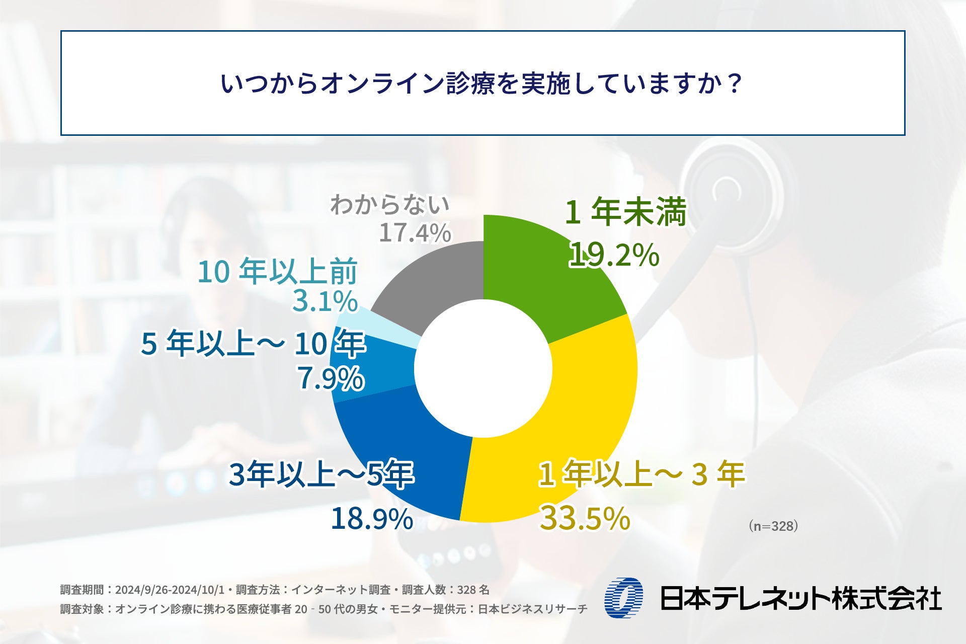 まず、「いつからオンライン診療を実施しているか」を尋ねる設問への回答は1位が「1年~3年」で33.5%、2位が「1年未満」で19.2%となりました。1位と2位の回答を合計すると回答率50%を超える結果となり、オンライン診療をしている医療機関の半数以上が、直近3年以内にオンライン診療を開始していることがわかりました。