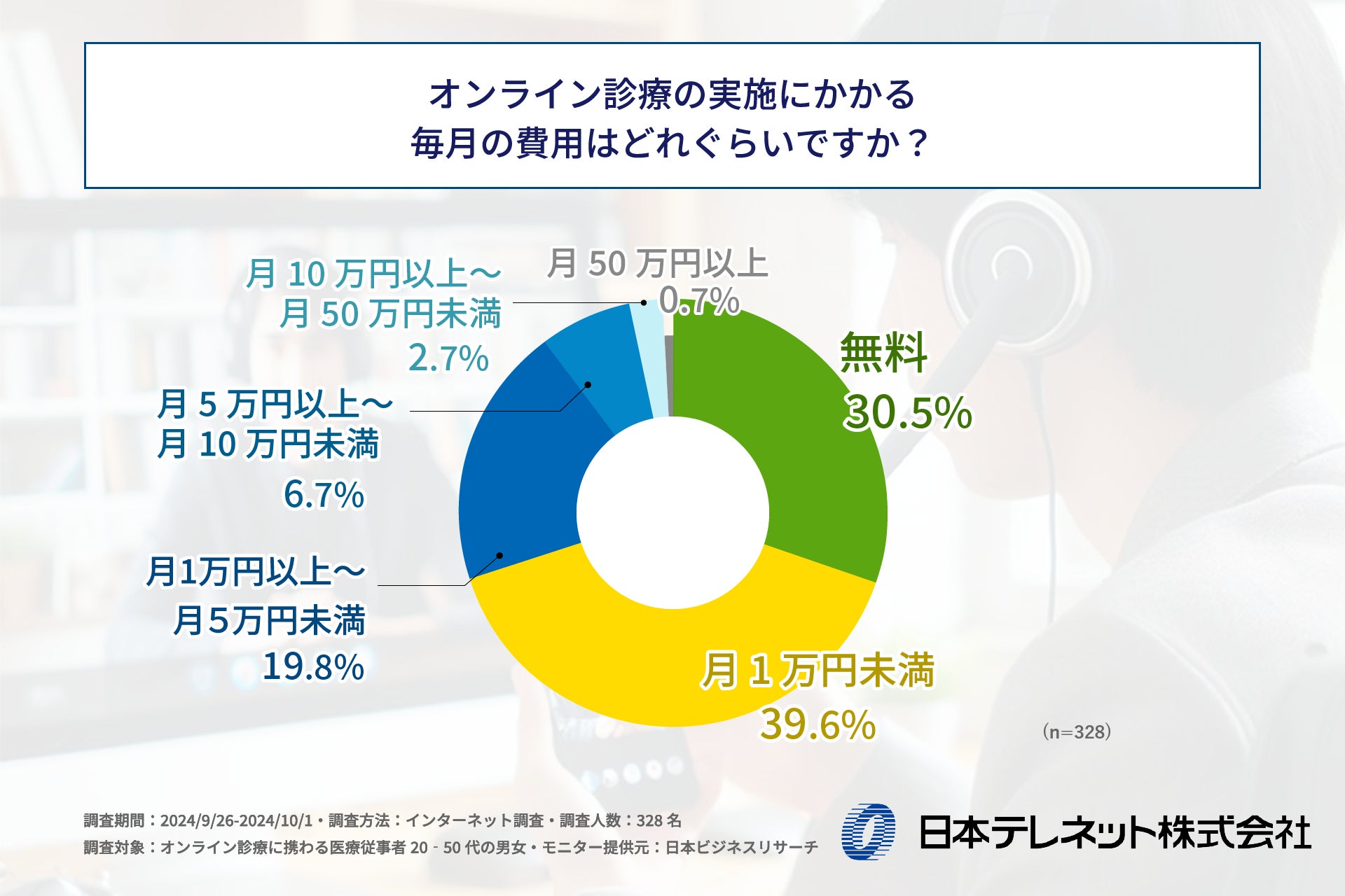 オンライン診療の実施にかかる費用は、毎月1万円未満である医療機関が約7割