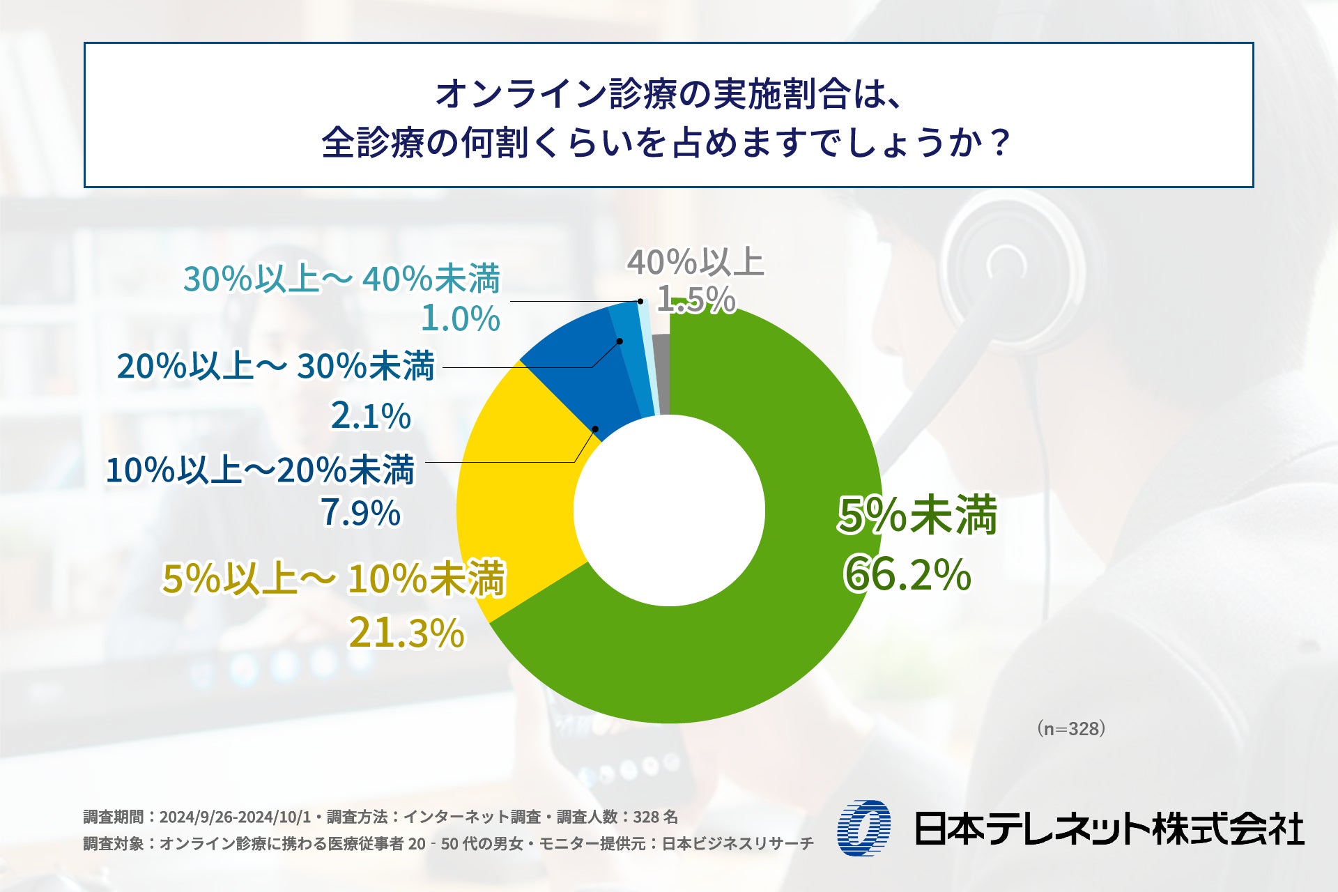 次に「オンライン診療の実施割合は、全診療の何割くらいを占めるか」を尋ねる設問の回答は1位が「5%未満」で66.2%、続いて2位が「5%以上~10%未満」で21.3%、3位が「10%~20%未満」で7.9%となりました。この結果から、全診療のおけるオンライン診療の実施割合が20%未満である医療機関の割合が95%以上であることが判明しました。