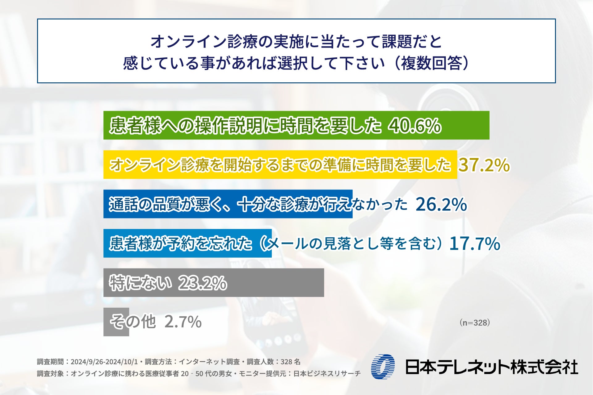 続いて「オンライン診療の実施に当たって課題だと感じていること」を尋ねる設問の回答では、1位が「患者様への操作説明に時間を要した」で40.6%、2位が「オンライン診療を開始するまでの準備に時間を要した」で37.2%、3位が「通話の品質が悪く、十分な診療が行えなかった」で26.2%という結果となりました。この結果から、オンライン診療の導入には、医療機関側だけでなく、患者側にも課題があるということがわかりました。