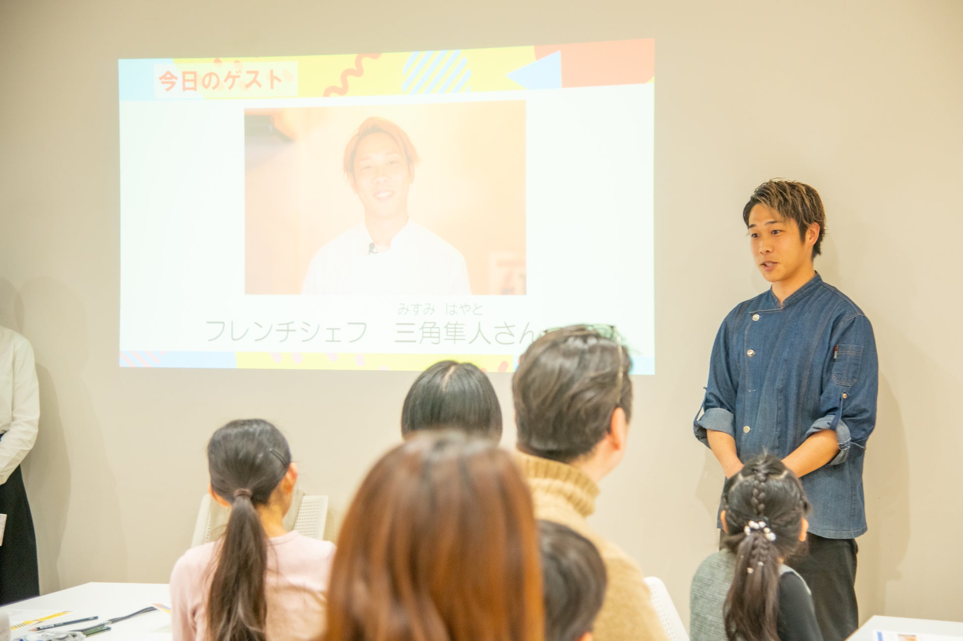 第1回目の「ガチスキ!學エン」では、フレンチシェフとして活躍する三角隼人さんにご登壇いただき、人生ストーリーを交えながら、どうやってプロのフレンチシェフになったのか?挫折や人生の転機などを伺いつつ、三角シェフのガチで好きなことである“お菓子作り”を子どもたちにも体験してもらいました。
