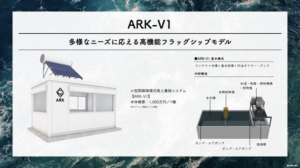 ARK(アーク)は「養殖の民主化」をミッションとして「どこでも誰でも水産養殖ができる仕組み」を提供するため小型・分散型のCRAS(Closed Recirculating Aquaculture System)と呼ばれる閉鎖循環式陸上養殖システム「ARK」等の開発・販売をおこなっています。既存の大規模養殖システムとは異なり、小規模な投資と運用で分散型の水産養殖を始めることができます。また再生可能エネルギーを活用することでオフグリッドでの稼働が可能であると同時に、大幅にエネルギーコストと環境負荷を削減することができます。これらのハードウェアに加えて、養殖事業に必要となるリモート管理アプリケーション「STARBOARD BY ARK」、資材や種苗、飼育ノウハウを提供しています。