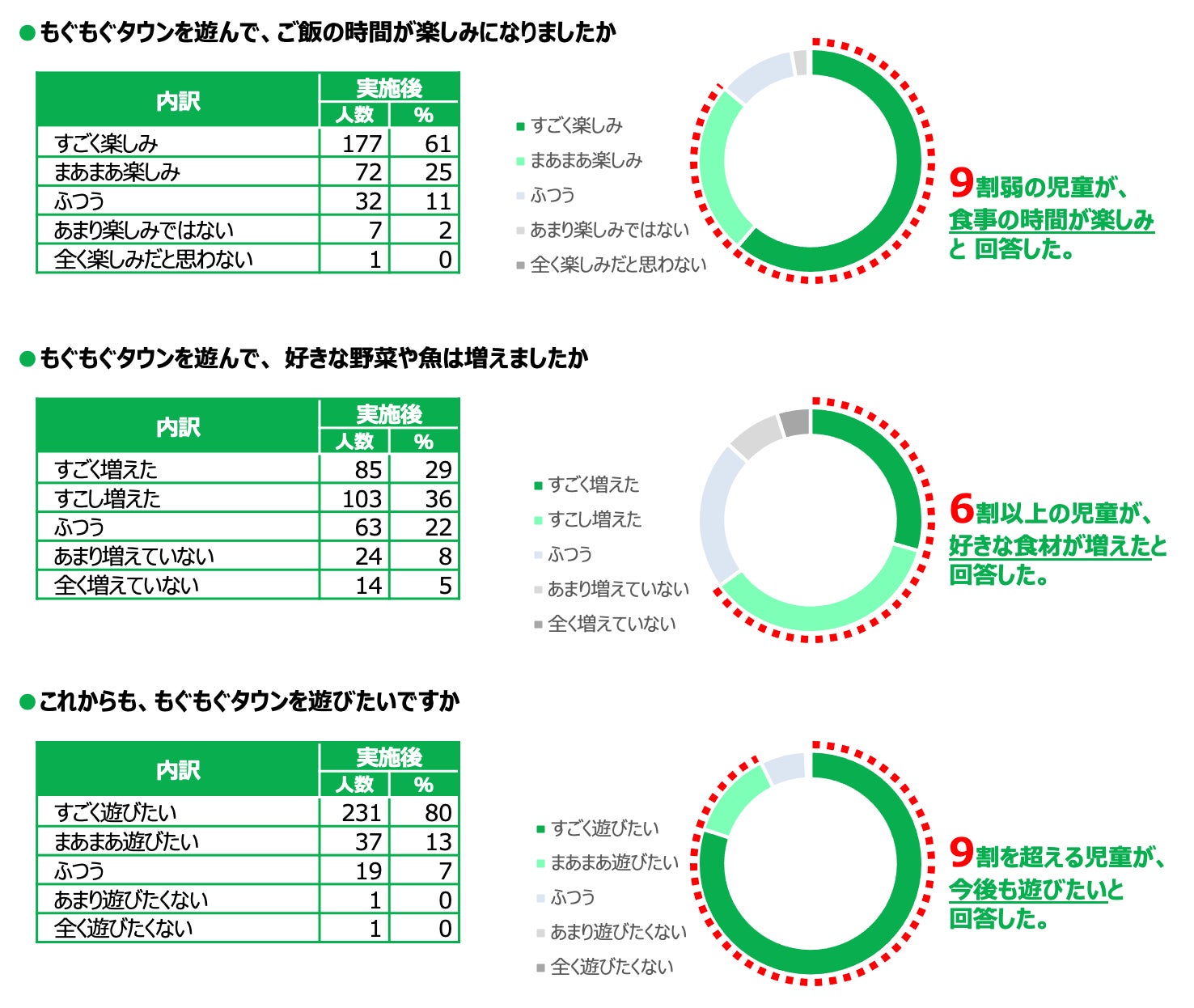 今回の調査において、子どもたちの『もぐもぐタウン』の継続利用意向は非常に高く、利用後は好きな野菜や魚が増えるなど、楽しみながらさまざまな食材にチャレンジすることを後押しできるアプリだとわかった。