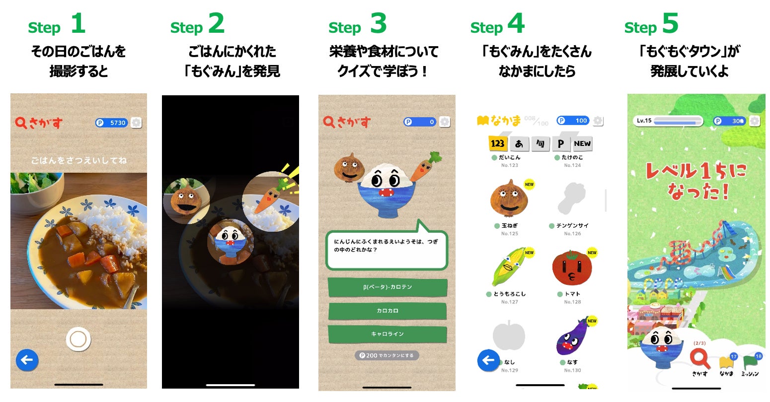 大塚製薬株式会社(本社:東京都 以下「大塚製薬」)が、「iOS」「Android™」向けに配信する『もぐもぐタウン』は、子どもが食や栄養について楽しく学べる食育ゲームアプリです。食事をカメラで撮影すると、その食事に含まれる食材のキャラクター「もぐみん」がARで出現します。食に関するクイズに答えると「もぐみん」を仲間にすることができ、最大100食材、25万種類の「もぐみん」を集めることで、『もぐもぐタウン』を大きく発展させていくことができます。