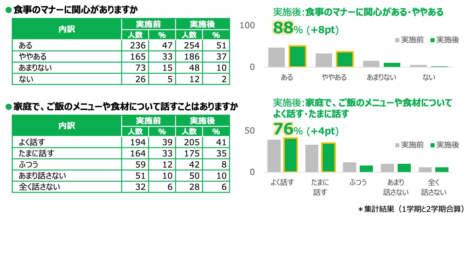 『もぐもぐタウン』を体験することで、食事マナーへの関心や、家庭での食に関するコミュニケーションが増加。