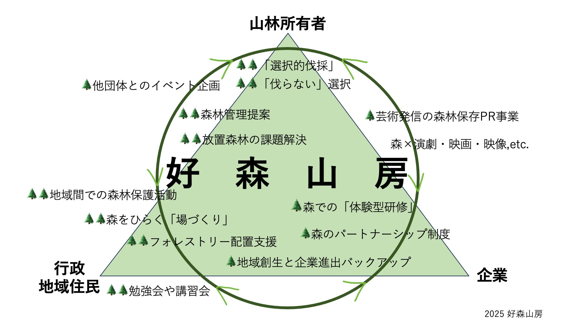 ・目的:持続的な森林管理のために、好森山房(民間)・地域・フォレスター(専門家)との連携(官民連携)を推進