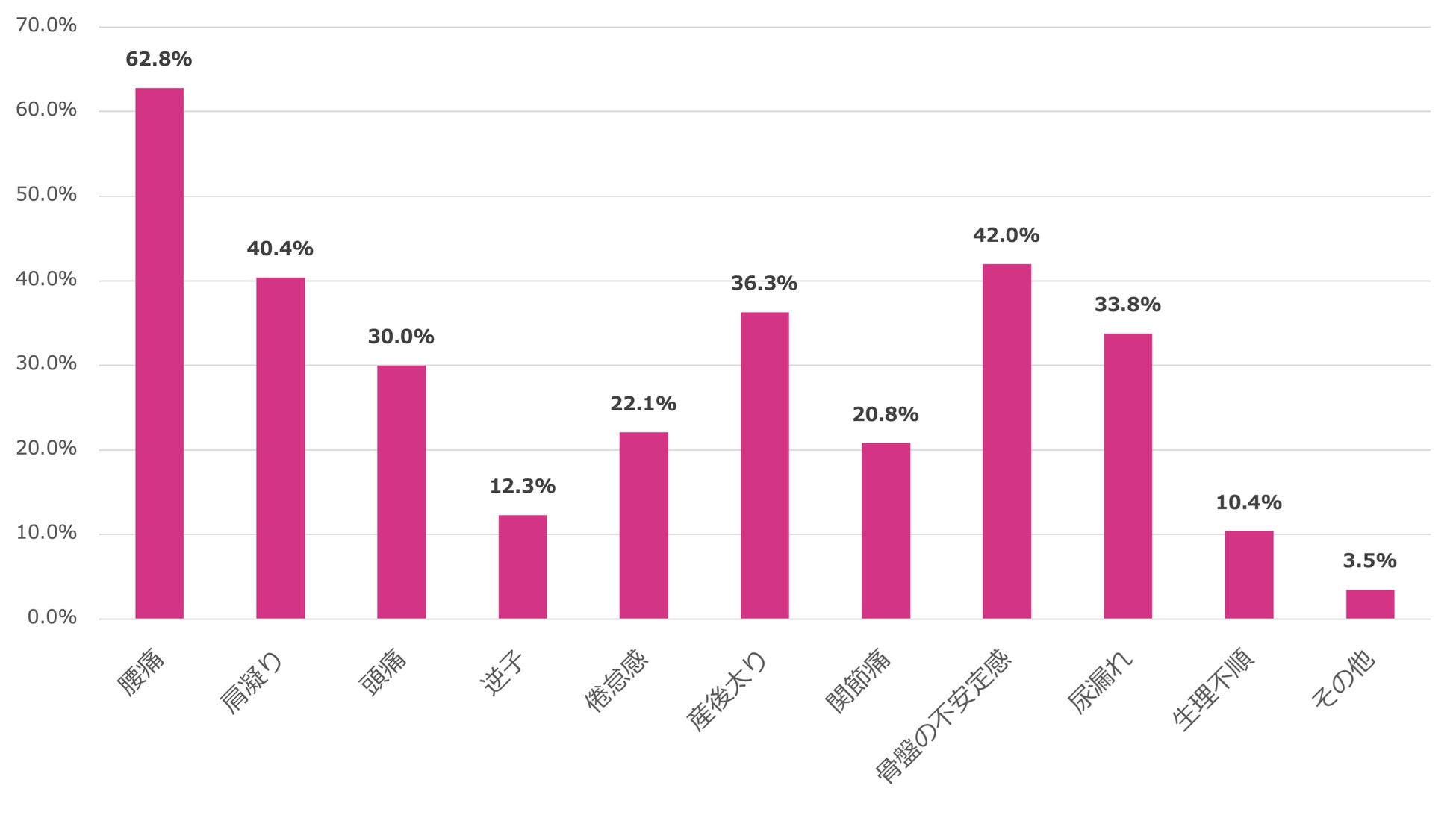 はじめに、妊娠中や産後に身体にどのような悩みがあったか聞きました。最も多かったのは「腰痛」で62.8%と多くの方が腰痛に悩まされたことがわかりました。その他、「骨盤の不安定感(42.0%)」、「肩こり(40.4%)」、「産後太り(36.3%)」、「尿もれ(33.8%)」と、3割を超える悩みが続き、多くの方が妊娠中や産後に複数の不調を抱えているようです。