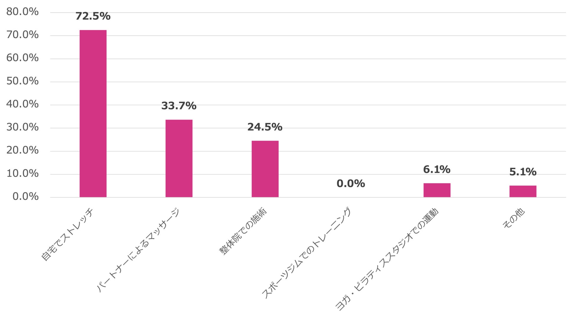 次に、「産前に身体のケアを行っていた」と答えた方に、どのようなものを行っていたか聞いたところ、「自宅でストレッチ」が72.5%で最も高く、続いて「パートナーによるマッサージ(33.7%)」、「整体院での施術(24.5%)」という結果になりました。自宅でいつでも、気軽にできるケアを行う方が多かったようです。