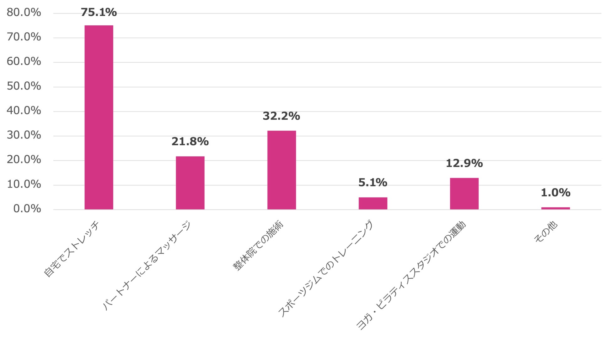 続いて、「産前のケアで何が重要だと考える」かについて聞いたところ、「自宅でストレッチ(75.1%)」、「整体院での施術(32.2%)」、「パートナーによるマッサージ(21.8%)」という順に高い結果となりました。実際には何も行わなかった方も含め、自宅で気軽に行うことが可能な「ストレッチ」が、一番高い結果となりました。