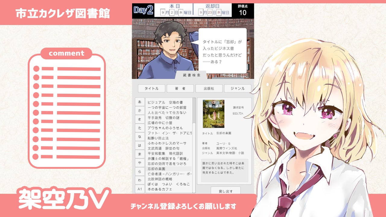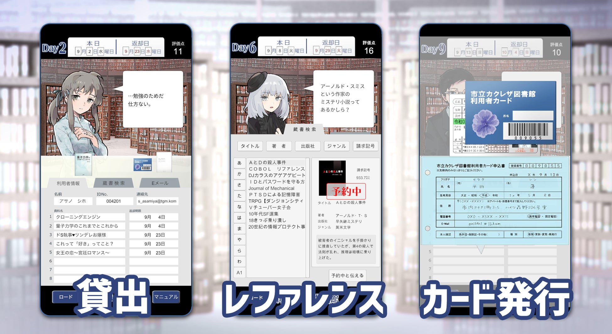 プレイヤーが「市立カクレザ図書館」の新人職員となり、カウンターで貸出業務を行う司書体験アドベンチャーゲームです。