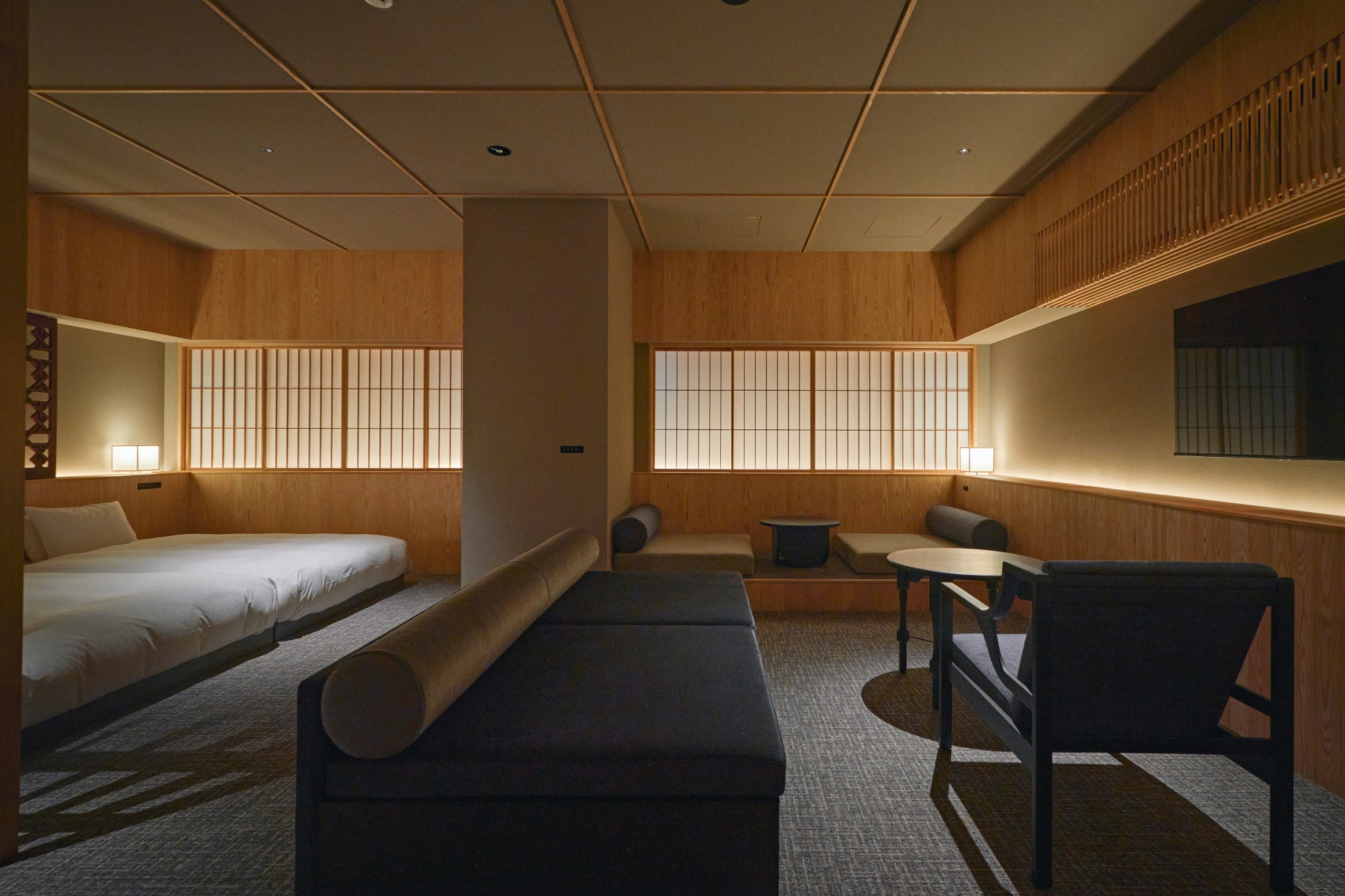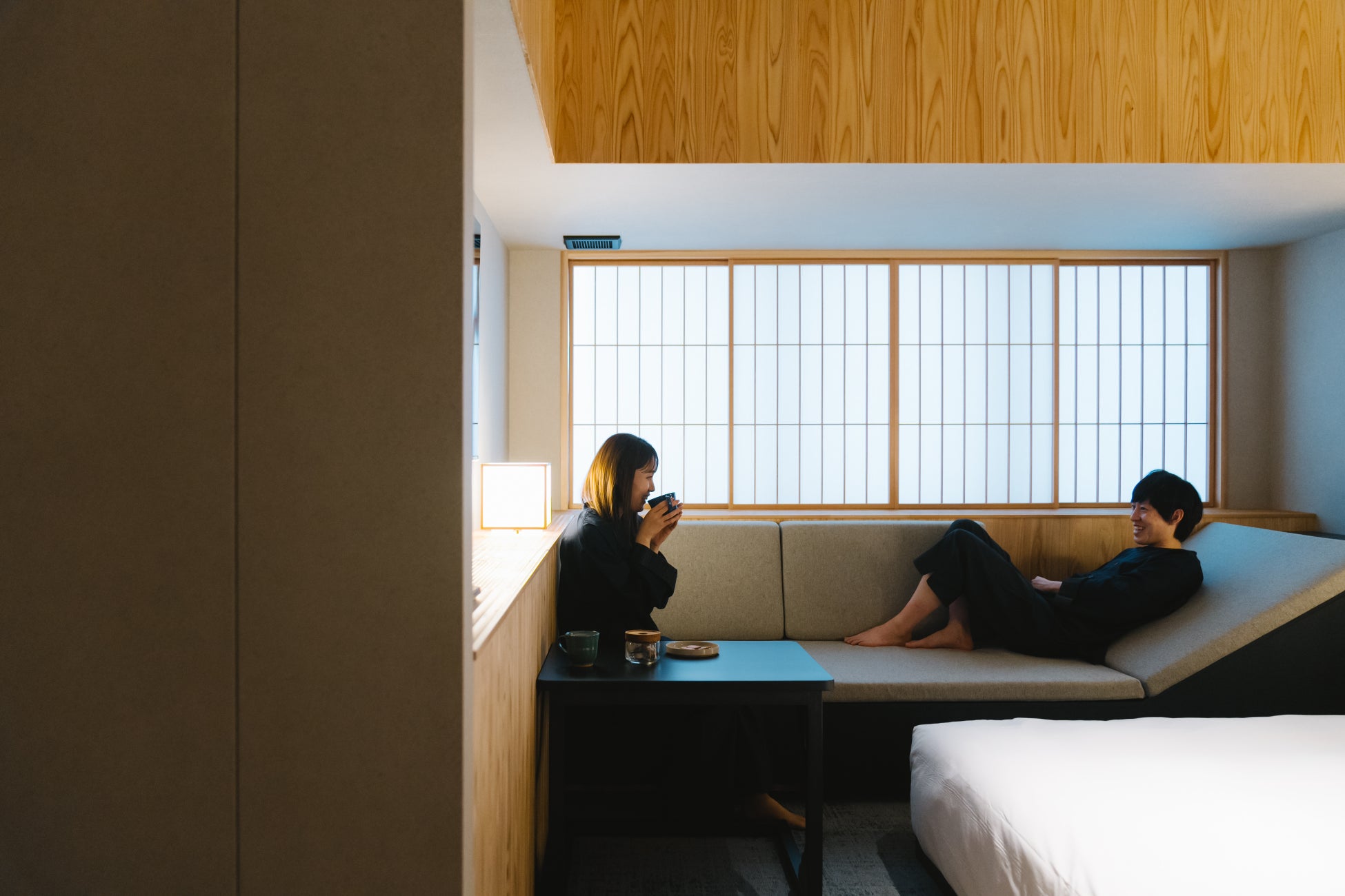 「おこもり感」をデザインコンセプトとした和と洋の文化がとけあうプライベート空間では、高知県産のスギ無垢材をふんだんに使った内装と、落ち着いた雰囲気を演出する家具と照明によって、「自分を洗濯する旅」にふさわしい、ゆったりとしたくつろぎの時間が流れます。