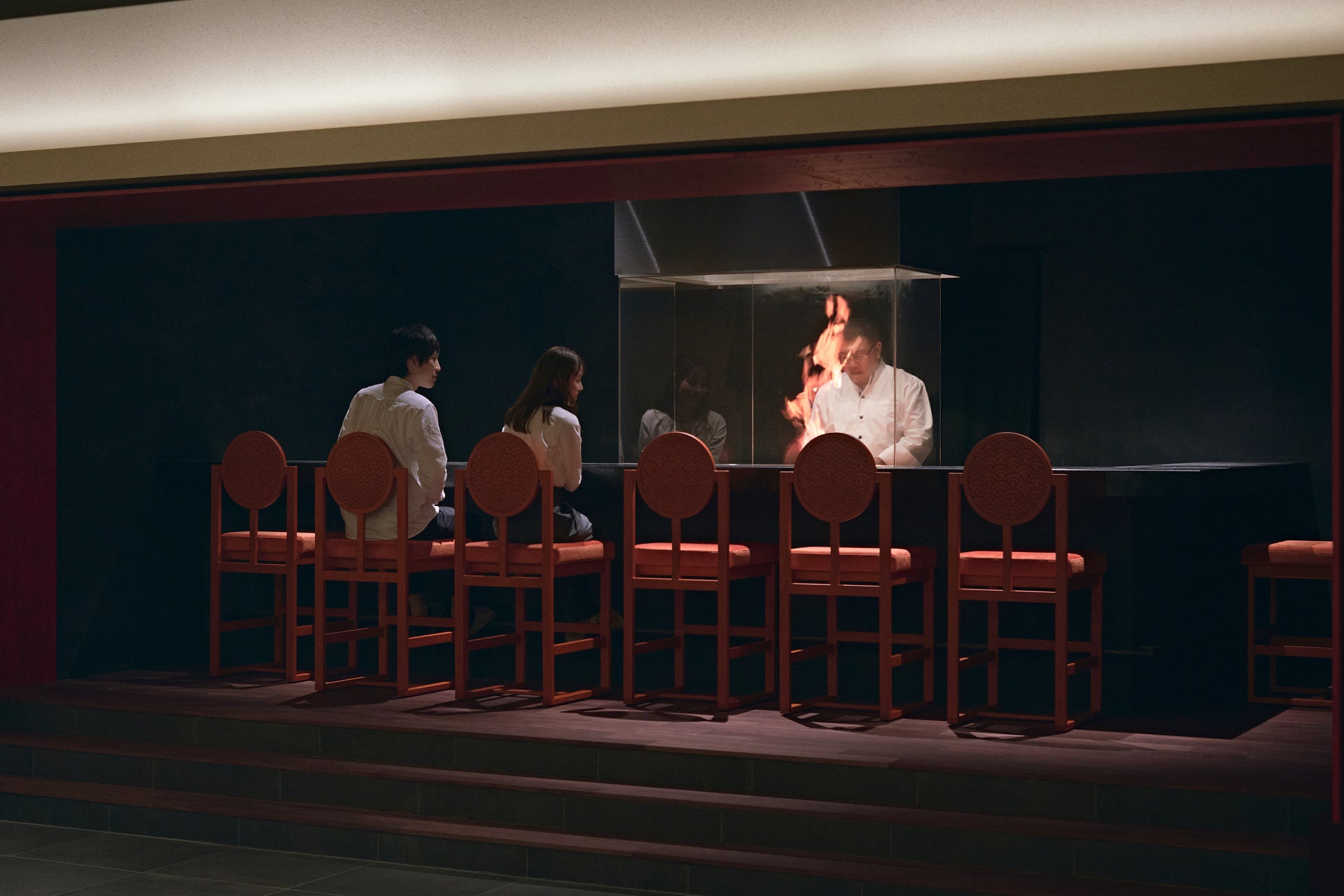 高知における新しい食の魅力のデスティネーションとなるレストラン。坂本家家紋をアレンジした格子越しに光がはいる空間で、モダンな赤と墨色を基調としたインテリアが特徴的です。