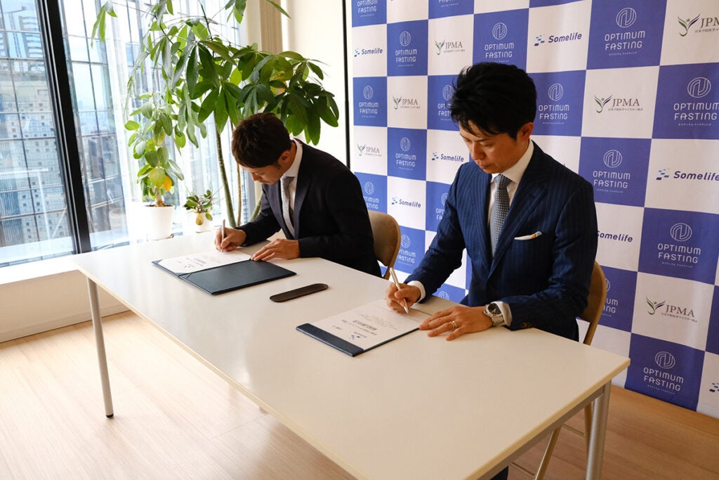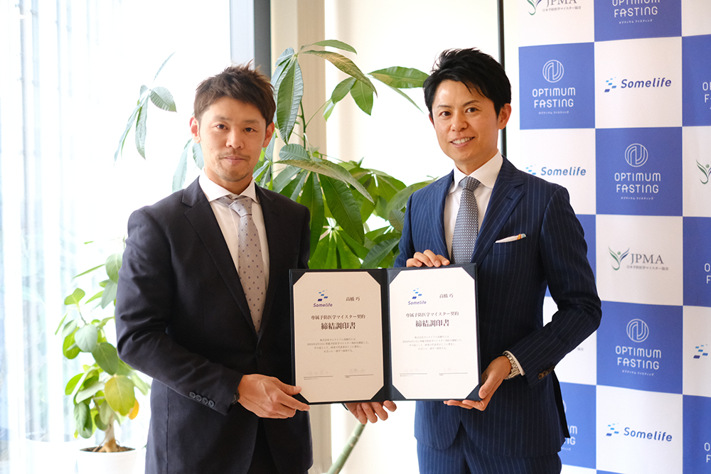 オートバイレースで有名な「鈴鹿8時間耐久レース」にて、記録トップタイとなる5度の優勝を果たした高橋巧選手(日本郵便 Honda Dream TP)と株式会社サムライフ 代表取締役 坂田武士とで、「専属予防医学マイスター契約」の調印式が行われました。