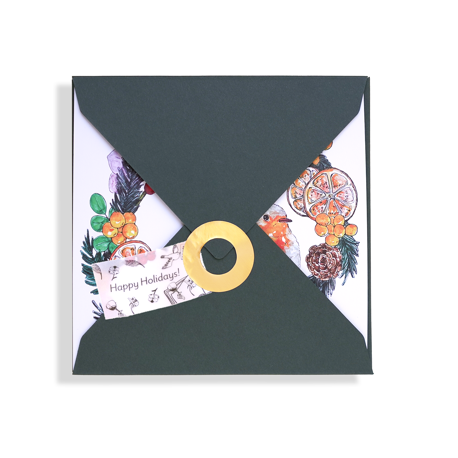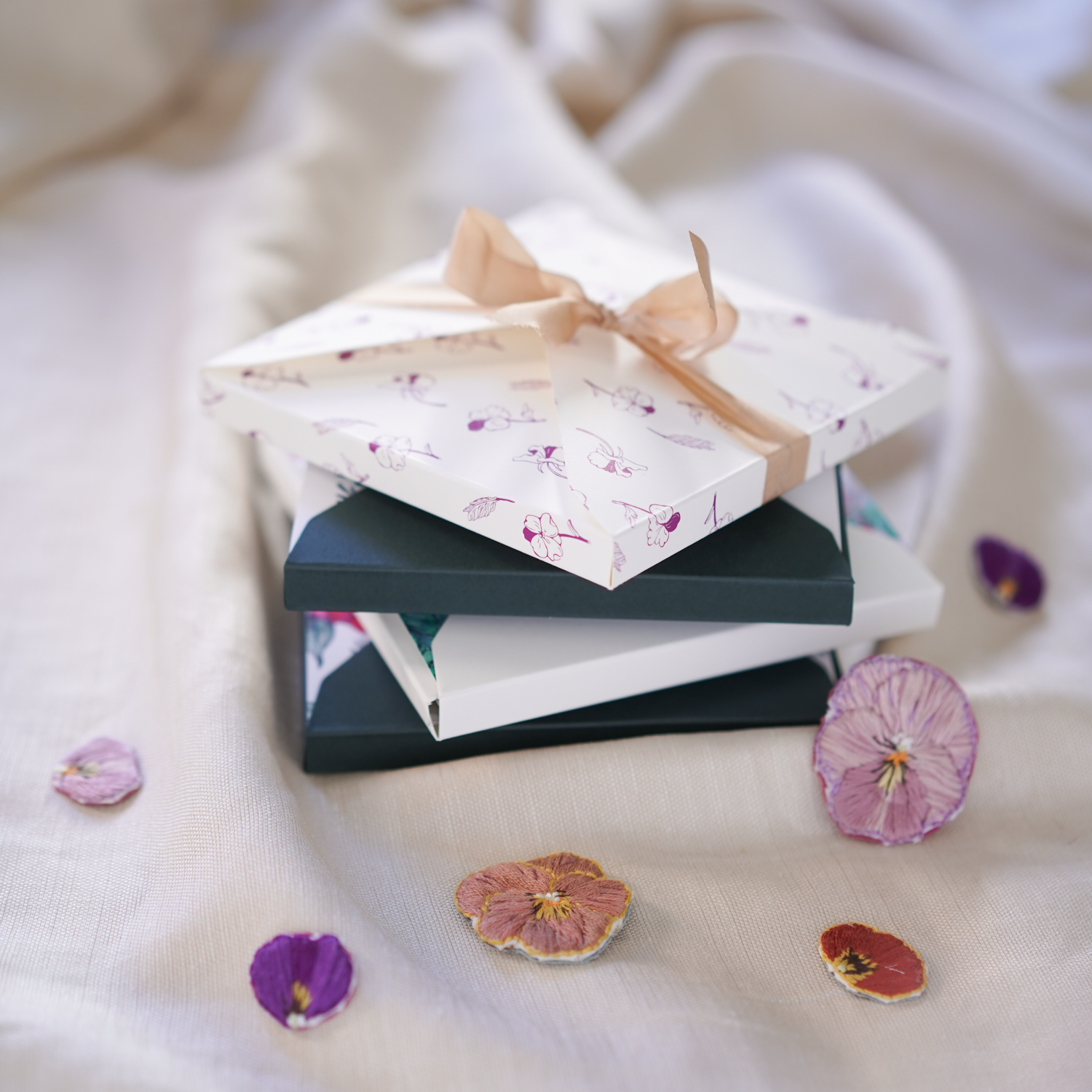 手のひらサイズの封筒ボックスに、わくわくしながら想いを詰めて「言葉を贈る」、これがわたしたちの届けるギフトです。季節のカードや封筒を選び、クラフト・スイーツを組み合わせ、贈る方がわくわくするようなギフト体験をご提案します。ボタニカルイラストレーションの彩色画が手触りの良いカードペーパーにプリントされたグリーティングカードが、ギフトを彩ります。