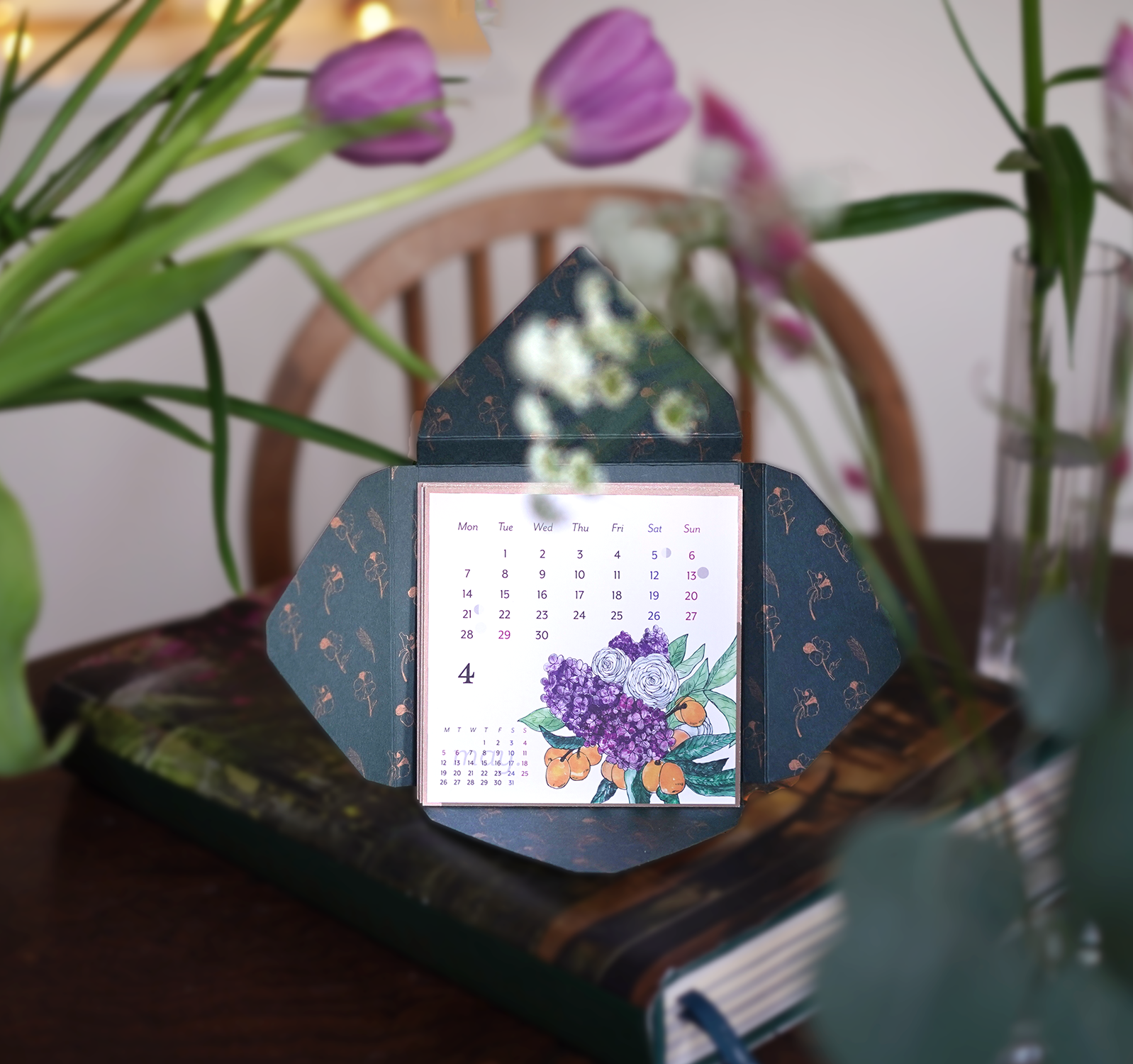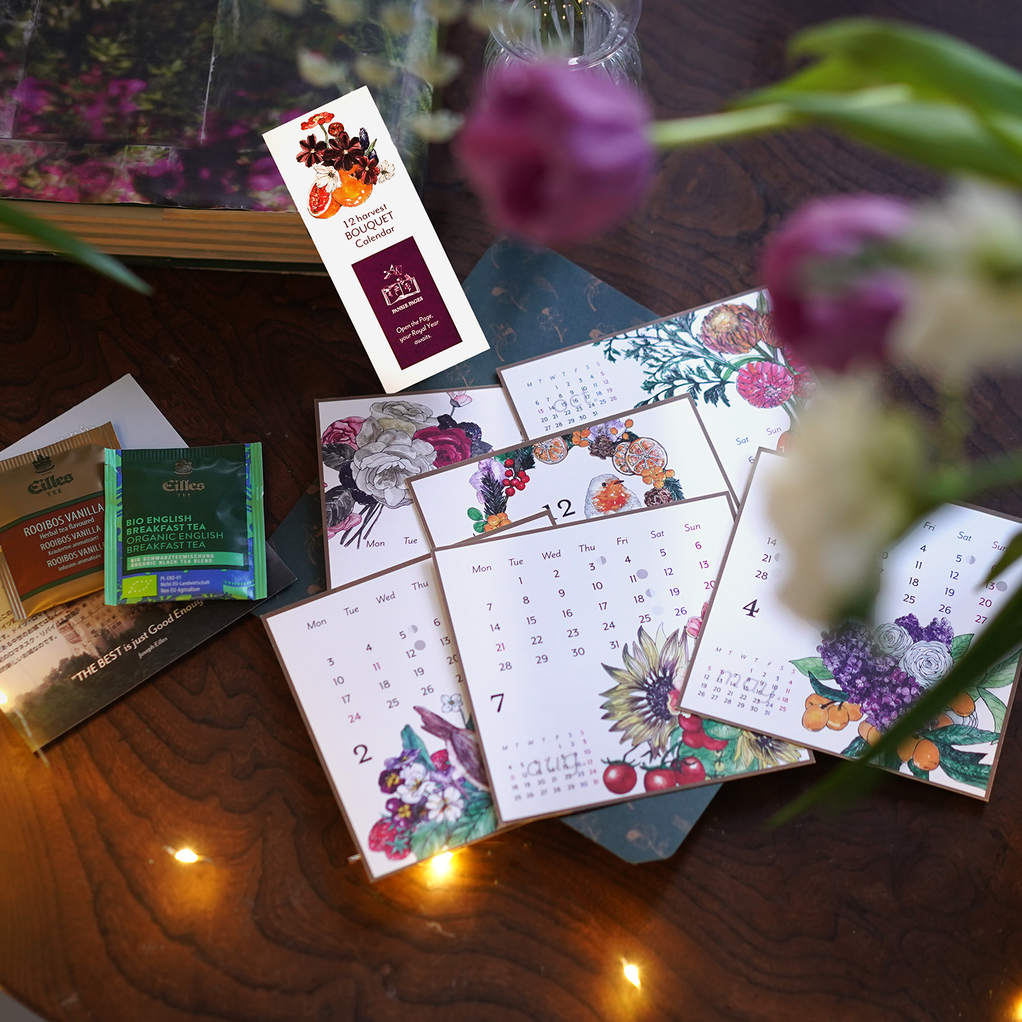 季節限定の[ハーヴェストブーケのカレンダー]は、彩色画の魅力が12枚詰まった、ちいさな絵画館のようなカレンダーです。