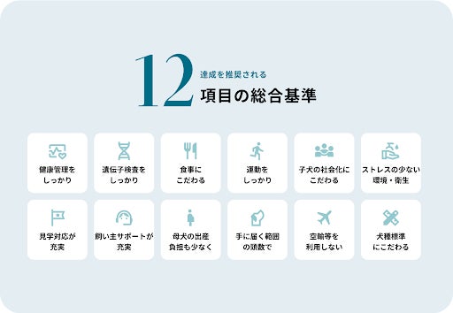 遺伝リスクを抑えた繁殖、劣悪な環境の排除、断尾・断耳の不実施など、アニマルウェルフェアを徹底。合格率10%未満という厳しい基準をクリアした優良ブリーダーのみを厳選しています。