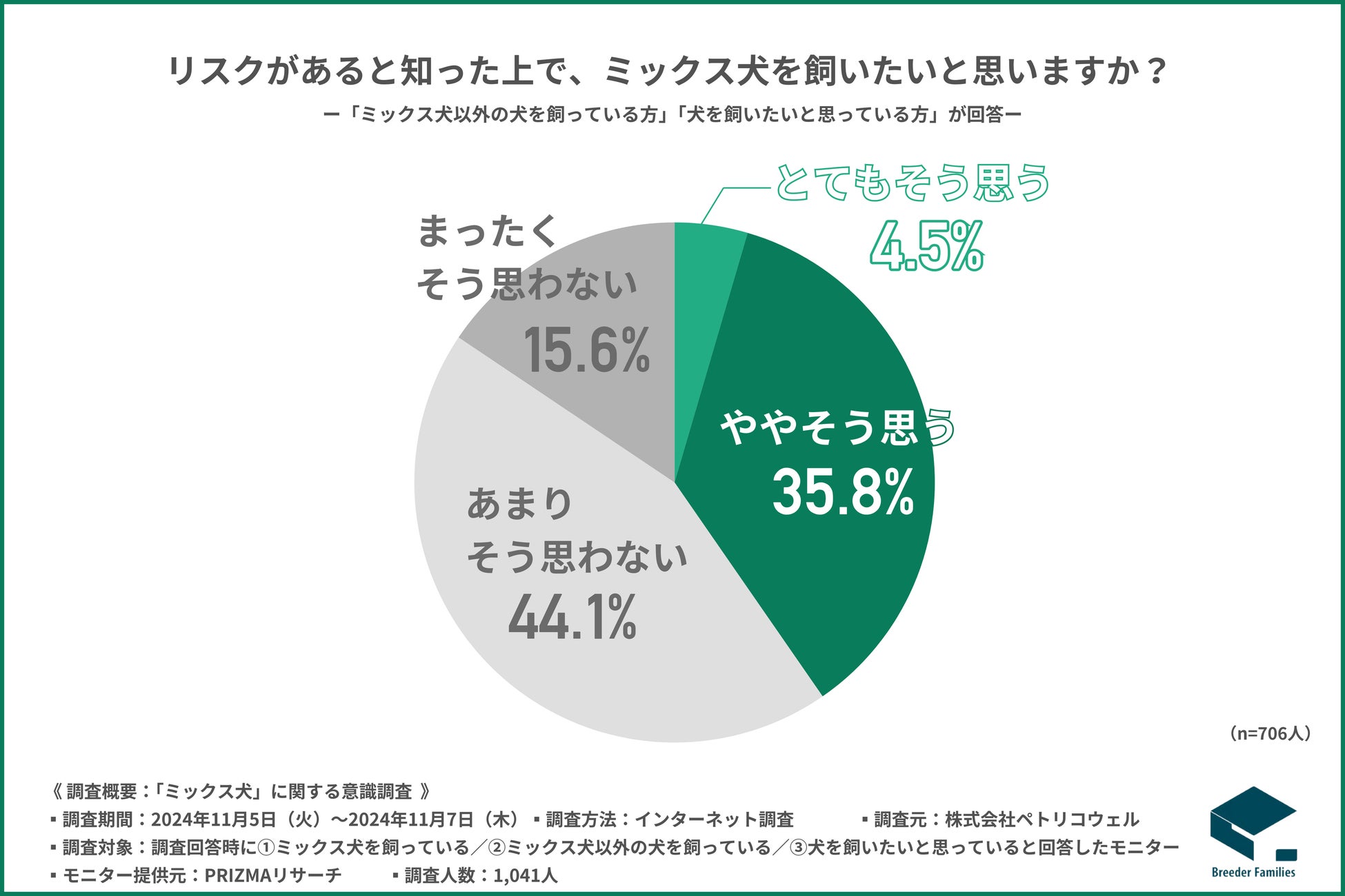 「リスクがあると知った上で、ミックス犬を飼いたいと思いますか?」と質問したところ、約4割の方が『とてもそう思う(4.5%)』『ややそう思う(35.8%)』と回答し、リスクがあると知った上でも、ミックス犬を飼いたいと思う方が4割を超える実態が明らかになりました。