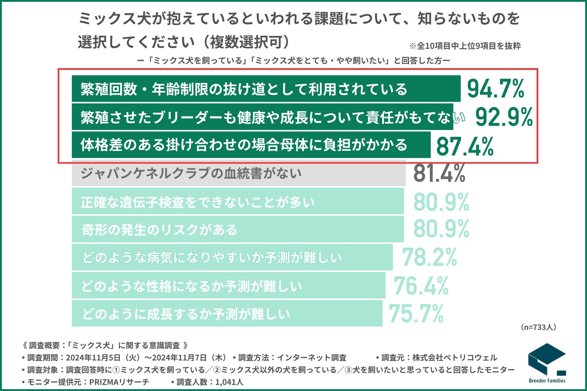 また、ミックス犬自身が抱える課題以外の、『繁殖回数・年齢制限の抜け道として利用されている』、『繁殖させたブリーダーも健康や成長について責任がもてない』といった社会問題や、『体格差のある掛け合わせの場合母体に負担がかかる』といった問題を認識している方も非常に少ないことが明らかになりました。