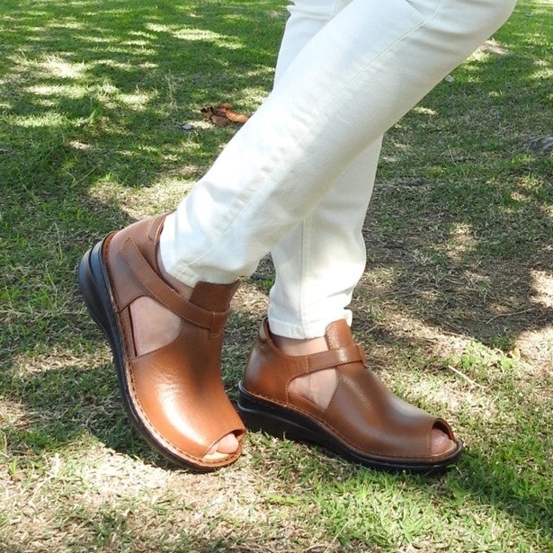 外反母趾・内反小趾の関節部を圧迫しないよう、切り替えやステッチを入れない工夫をしています。踵周りには固めの芯が入っており、左右の足ブレを防ぎます。