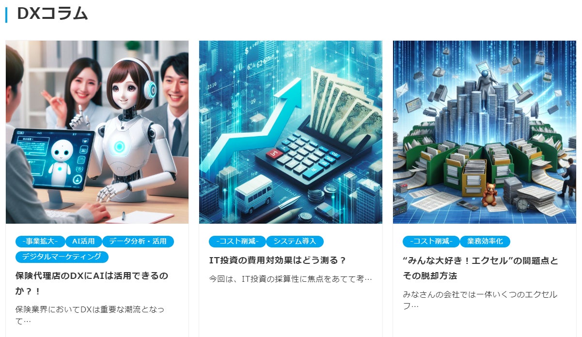 保険代理店のDX推進に必要な知識やノウハウ、業界の最新動向や成功事例、DXに関連するコラムなどを発信