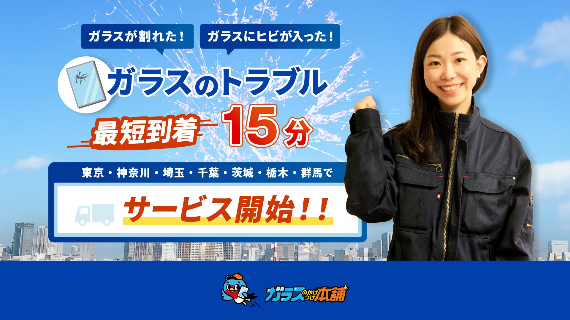 ガラスのかけつけ本舗はガラスの割れ、ヒビなどのトラブルの解決サービスを7都県(東京・千葉・埼玉・神奈川・茨城・栃木・群馬)を対象に展開します。出張見積もり無料の24時間対応でガラス割れやヒビといったトラブルを最短15分で到着し解決します。