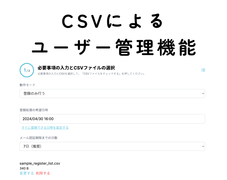 CSVによるユーザー管理機能は、メールアドレスの一覧を含むCSVファイルを使用することで、ユーザーの一括登録や削除を簡単かつ迅速に実行できる新たな機能です。この機能を利用することにより、大規模な組織でも効率的にユーザー管理が可能となり、運用ご担当者の作業負担を大幅に軽減します。