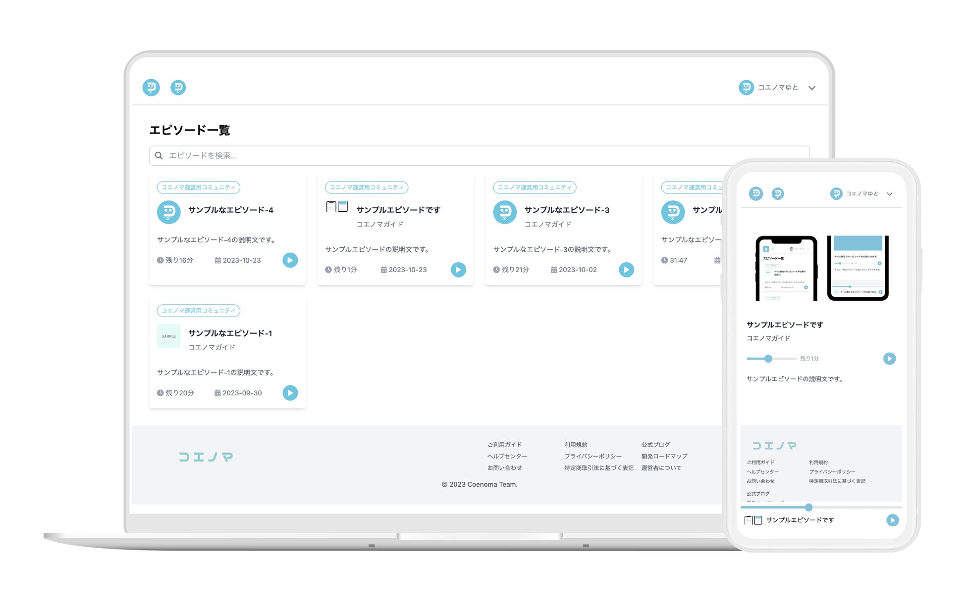 「コエノマ」は、特定のチームやコミュニティ内で音声コンテンツを限定配信できる、いちばん簡単なラジオ配信ツールです。聴きたいエピソードに簡単にアクセスできるアーカイブ機能や、テーマ別にコンテンツを整理できるプレイリスト機能を提供し、企業の社内ラジオやポッドキャスターの限定コンテンツ配信といった多様な用途でのコミュニケーションニーズに応えます。