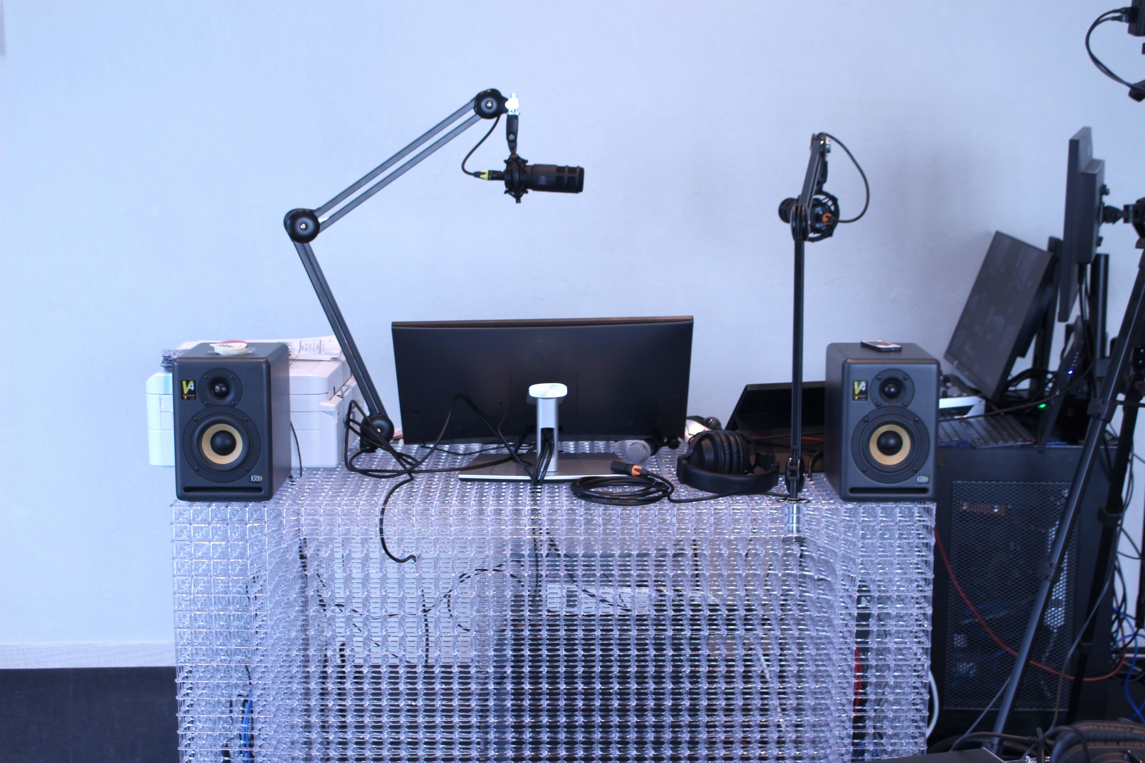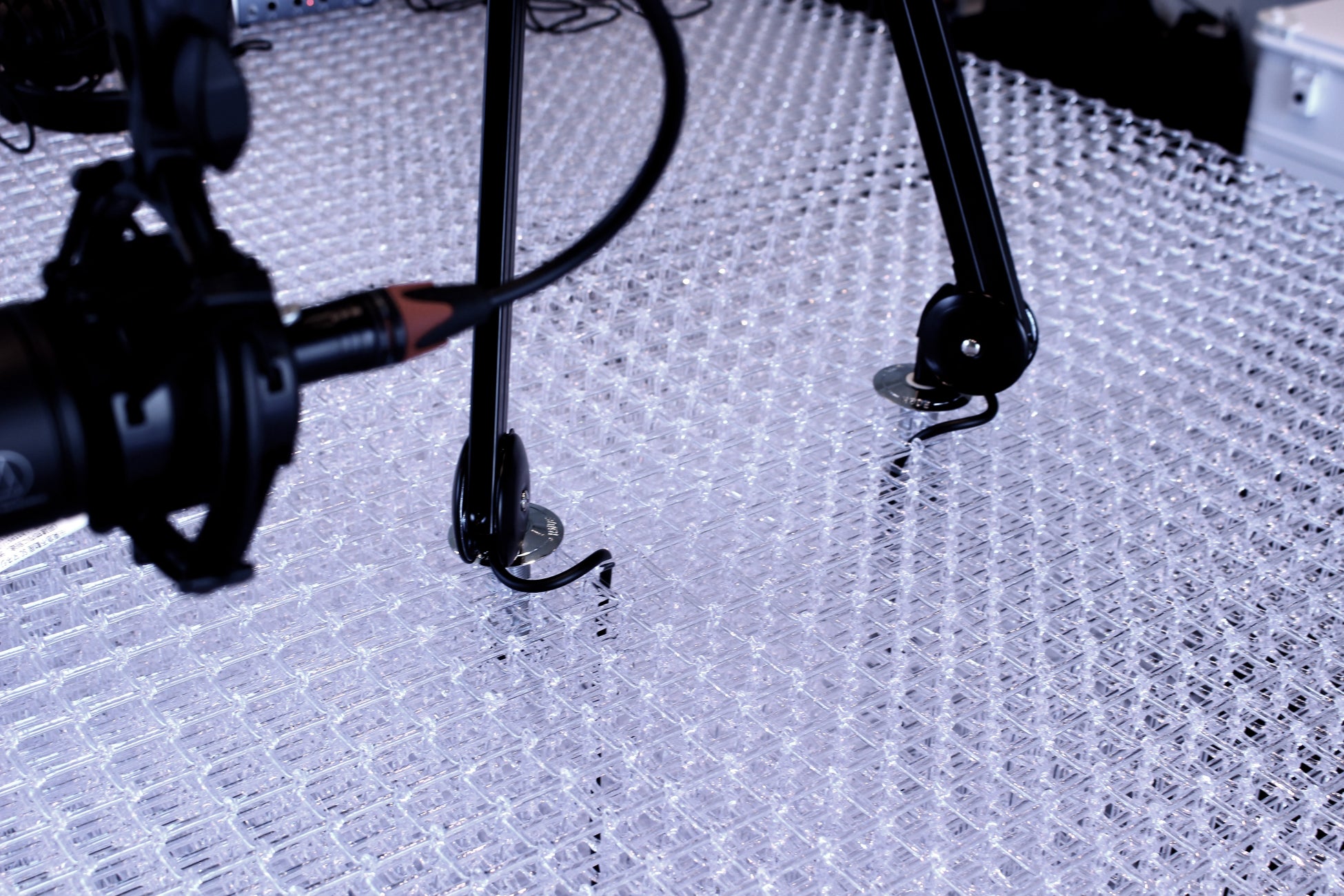 テーブルは、スタジオ内のエンジニア用と出演者用共に天板部分を薄くし、マイクスタンドを差しこんで固定が可能。エンジニア用のテーブルは、機材を左右足元に差し込めるよう、音響用ラック機材の規格分のスペースを開口させており、背面からは機材の配線を自由に取り回しできるようにしています。チェアは、座面部分をクッション等を追加で設置できるよう42cm規格にあわせ、座る人に違和感が無いよう底面にかけてテーパー(傾斜)をかけた構造に仕上げています。