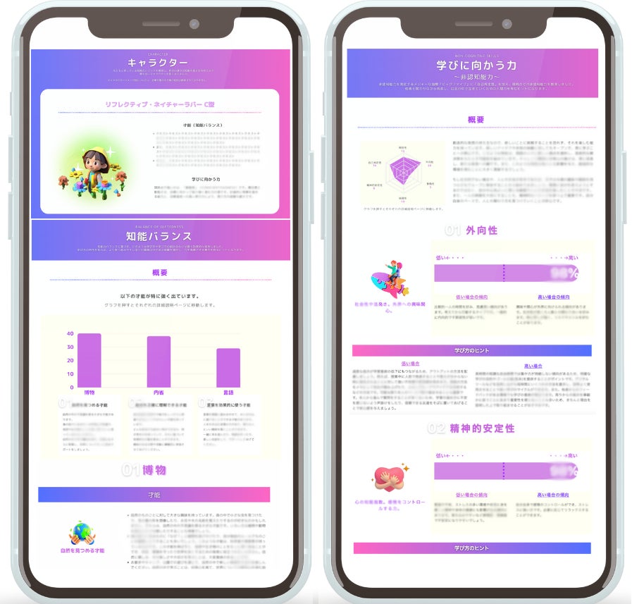診断結果は詳細なレポートとして提供され、子どもの知能特性と非認知能力についての洞察を得ることができます。レポートには、子どもの特性に応じた最適な学び方や活動の提案が含まれており、家庭や学校での教育に活用できます。子どもたちは自分の強みを最大限に活かし、より充実した学びの経験を積むことができるようになります。