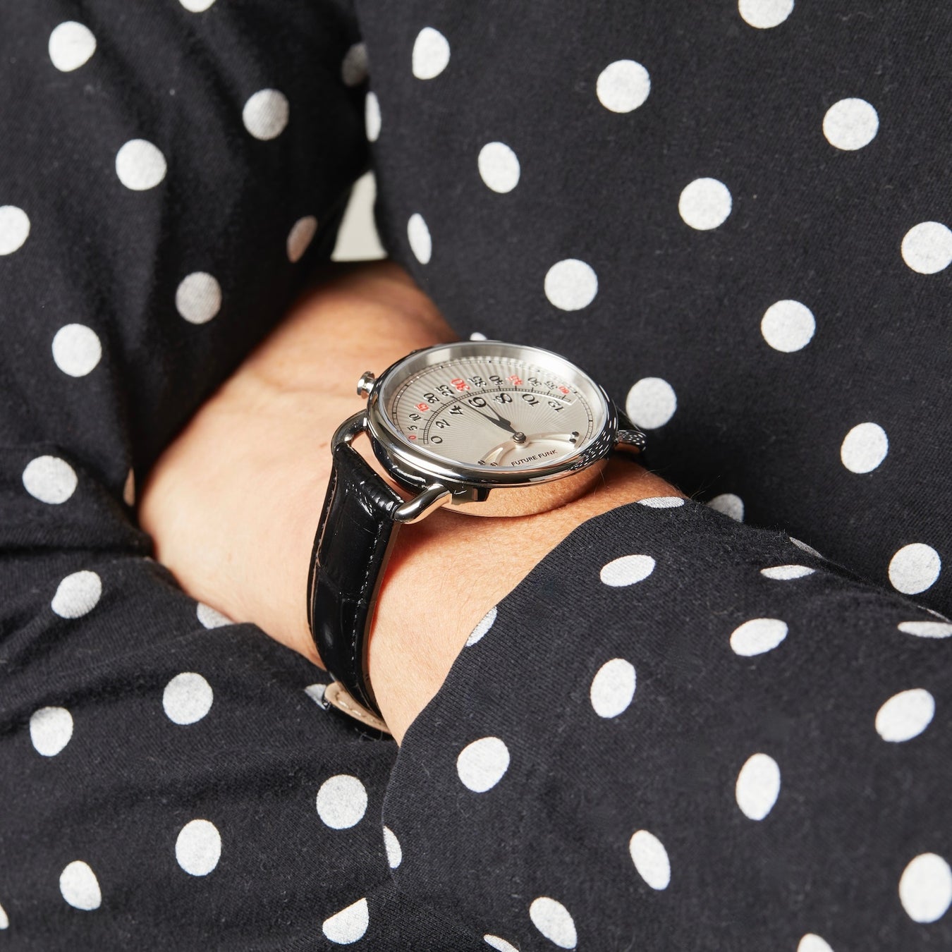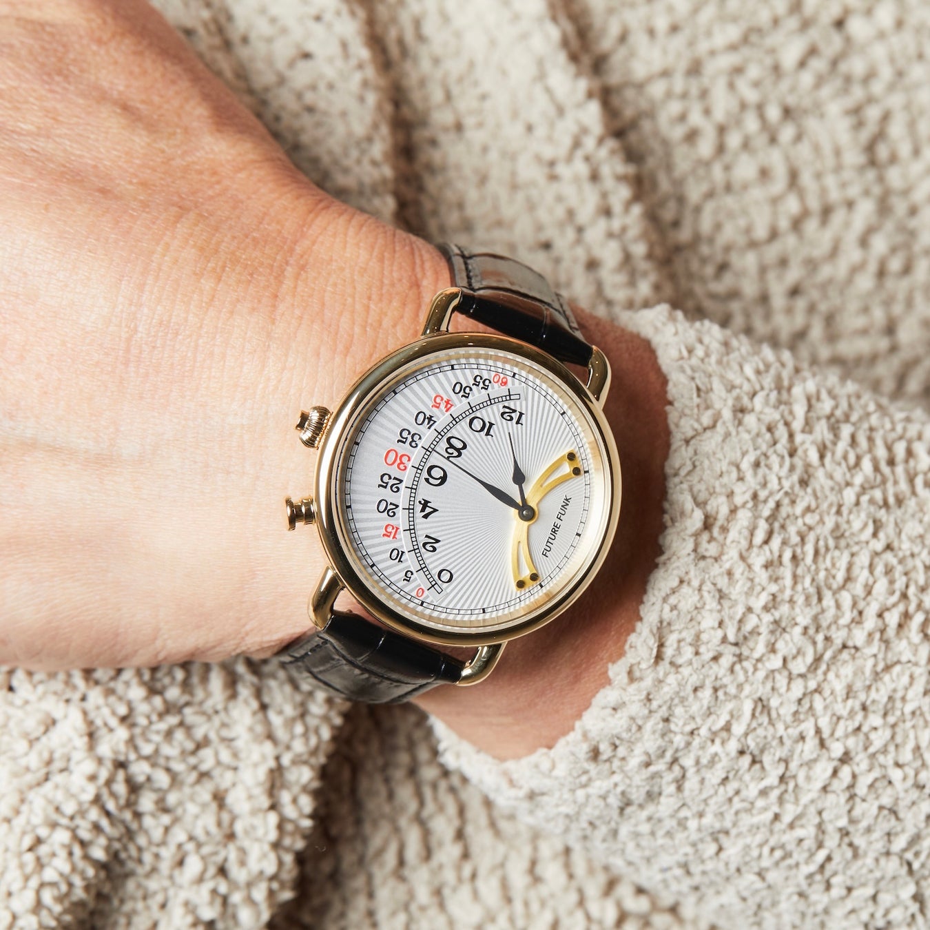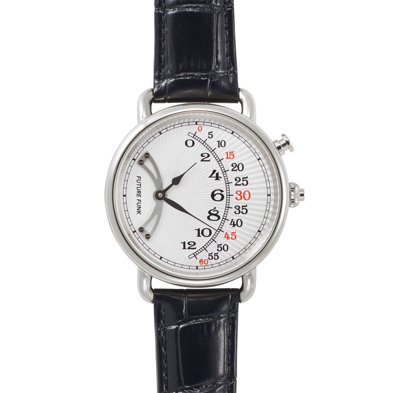 従来の時計のように、針が文字盤の中心を円を描いて動くのではなく、時刻を表す時針と分針が弧を描いて目盛上を動き、エンドに針が到達すると瞬く間にばねの力でフライバックして最初の位置(ゼロの位置)に戻るというユニークな動きをする時計です。