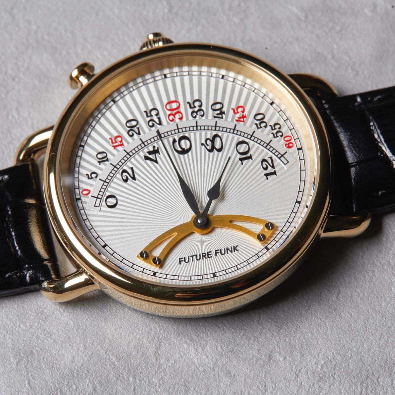 FUTURE FUNKのレトログラードモデルの魅力は視覚的な面白さにあります。上から下に動いてきた針が一瞬で最初の位置に戻るその瞬間の動きには、きっと心がくすぐられることでしょう。