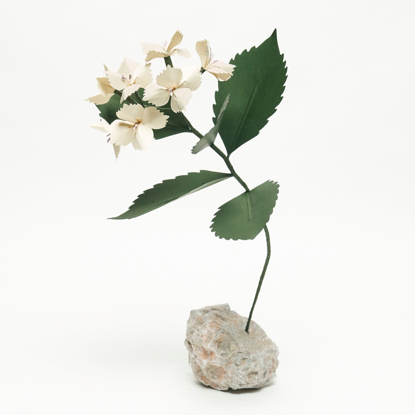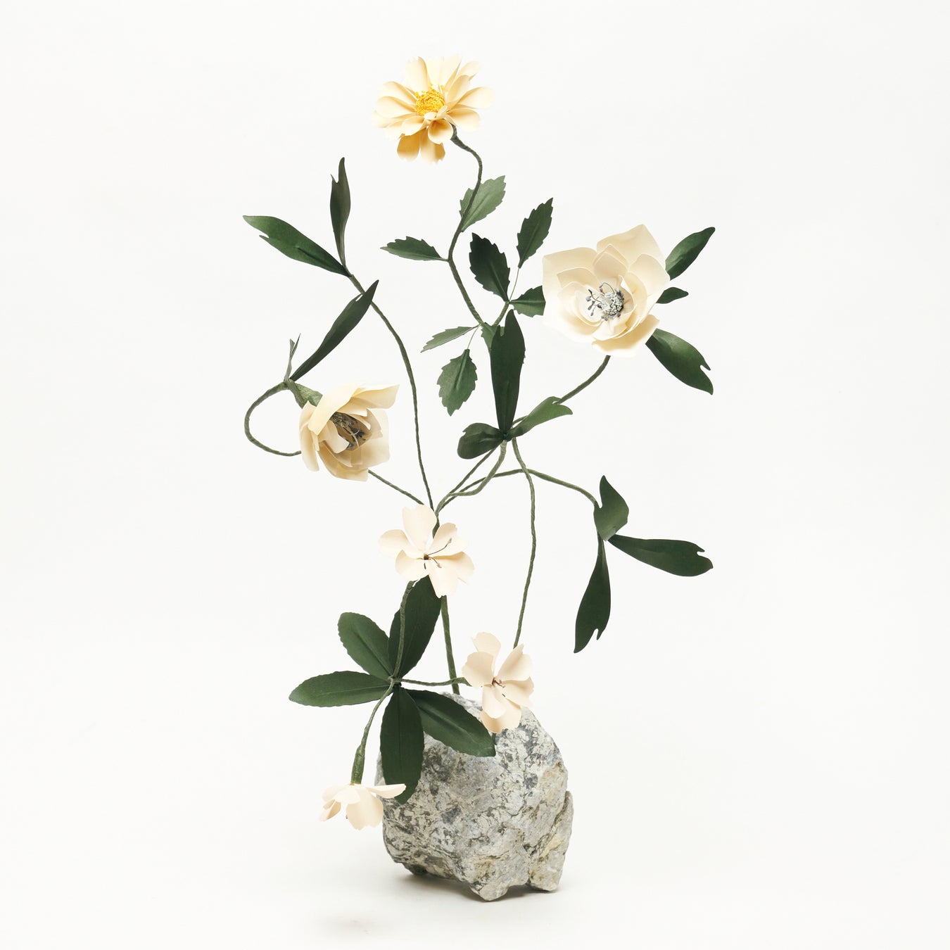 2017年からは、紙の花を創作するフラワーアーティストとして国内外で作品を発表しています。アートピースとして生み出された紙の花は、「花や植物の生と死、刹那的なものと永遠なものの間の深遠な領域」を探求する篠崎の作風を体現したシグネチャーです。篠崎がフリーハンドで描いた花の形を、日本原産の紙素材で立体的に造形し、山谷石や火山岩など世界各国から選び抜いた天然石を土台として組み合わせて制作しています。また、花と土台とを繋ぐワイヤーで作られた茎は、儚さとダイナミックさを感じさせる曲線を描き、光を求めて成長する植物の生命力を表しているようです。紙で表現する花の色や形は、篠崎が花と共に過ごしてきた過去のシーンがインスピレーションになっています。夜から朝に変わる光を浴びた芍薬の花、暗闇で見た百合の花、旅先で見かけた異国の花など、篠崎の過去の花の記憶が永遠に咲き続ける花として昇華されています。