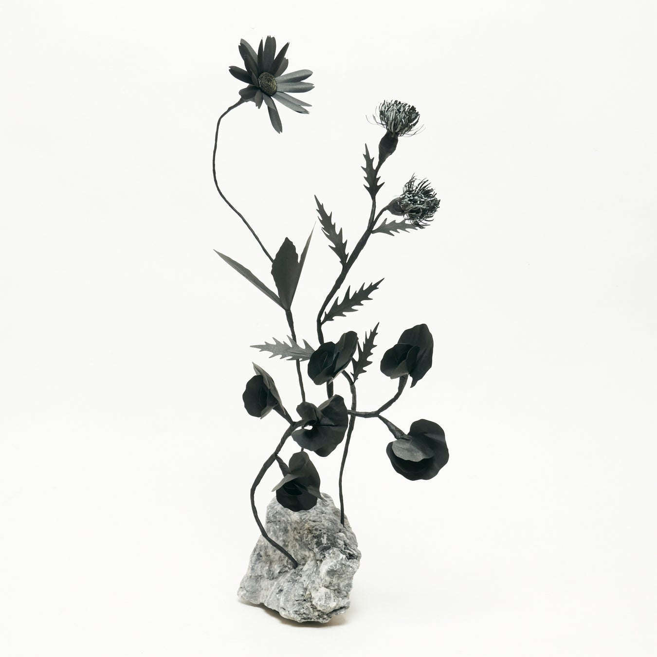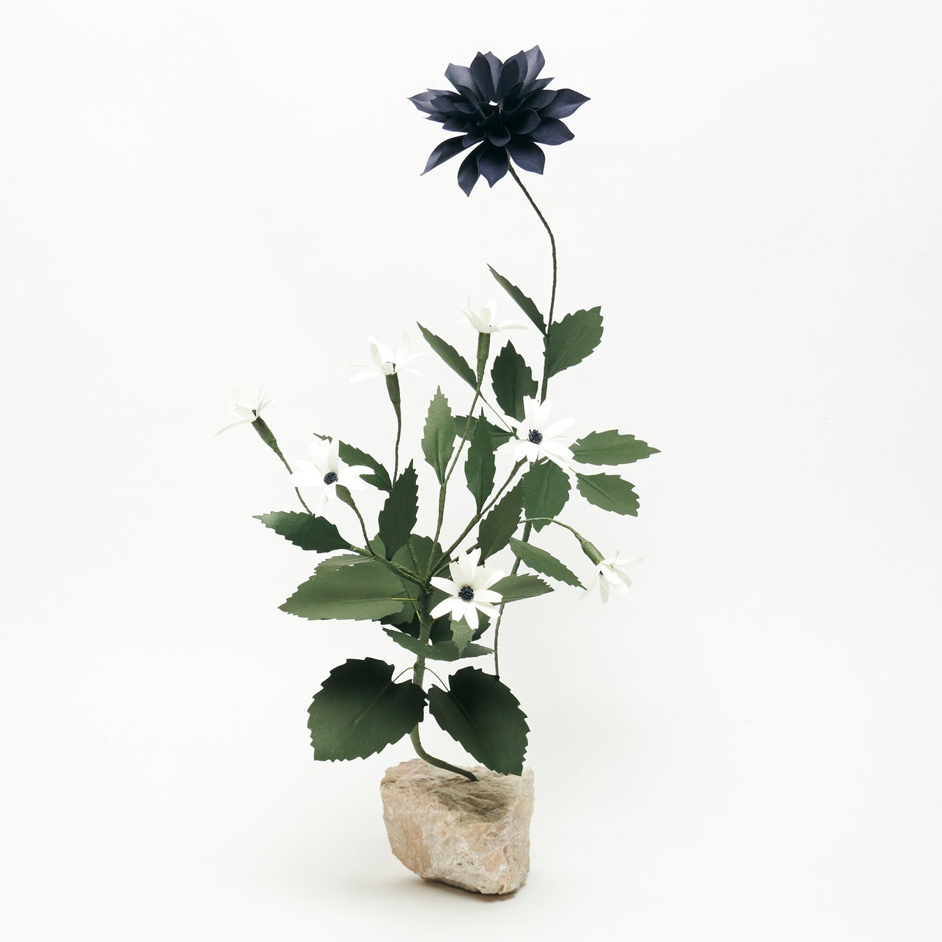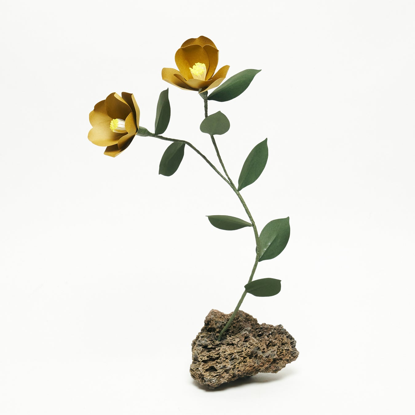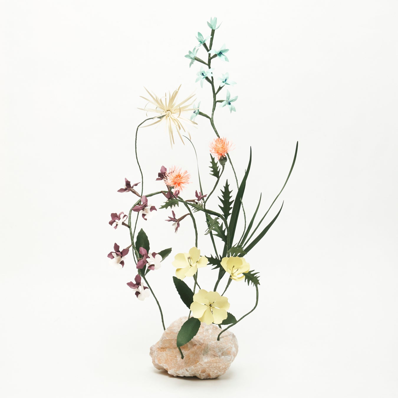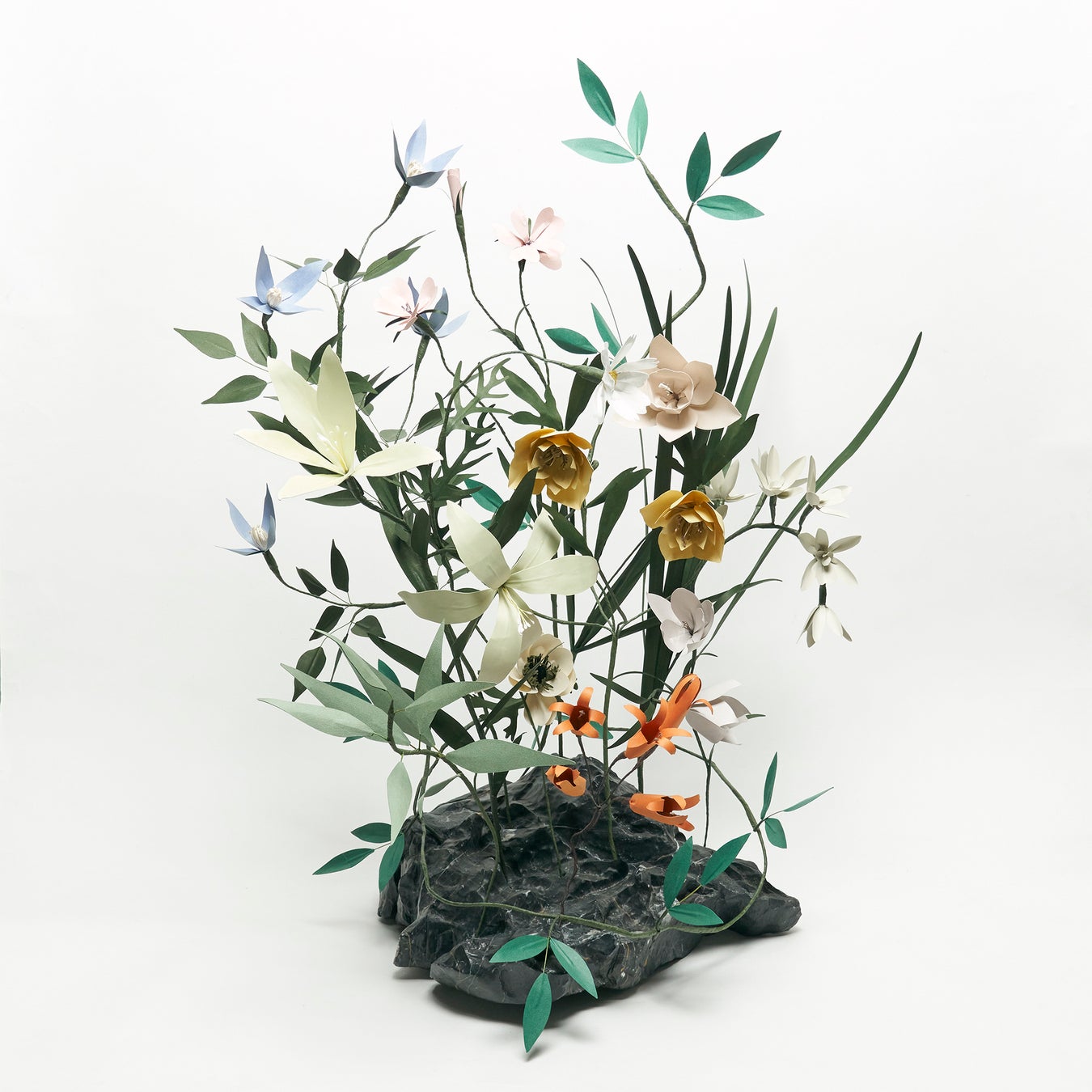 アーティストとフローリストの中間に立ち、紙やさまざまな素材を使って枯れない花を造形するアプローチと、自然サイクルの儚さと尊さをオマージュした創作をするいう対照的な2つをテーマにしている。