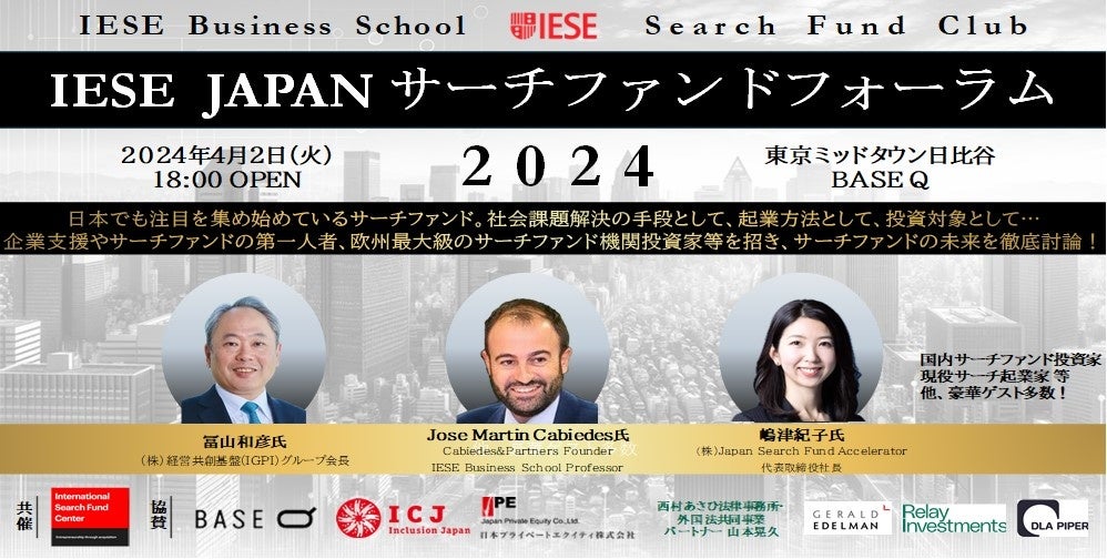 IESEビジネススクールは、2024年4月2日(火)18:30(開場18:00)より日比谷BASE Qにて、「IESE JAPANサーチファンドフォーラム」というサーチファンドに関するイベントを開催することとなりました。本フォーラムでは、スタンフォード大学と並び、サーチファンド研究の世界的権威であるIESEビジネススクールが、国内外の豪華登壇者の皆様を招待し、講演やパネルディスカッションを通じて、日本におけるサーチファンドの未来を多角的に考えます。